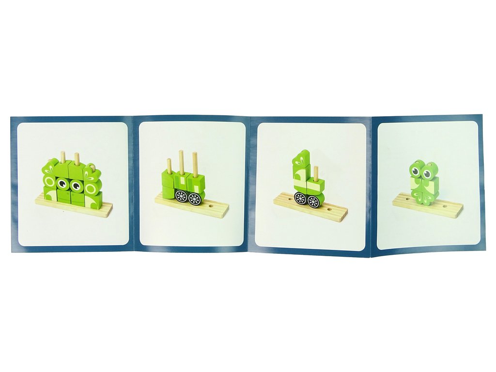 Детски комплект от дървени кубчета е отличен подарък за най-малките деца. Играчката развива фината моторика и въображението на детето. Кубчетата във формата на жаба се състоят от основа с колчета и 12 кубчета. От всички части можете да сглобите различни животни или предмети.