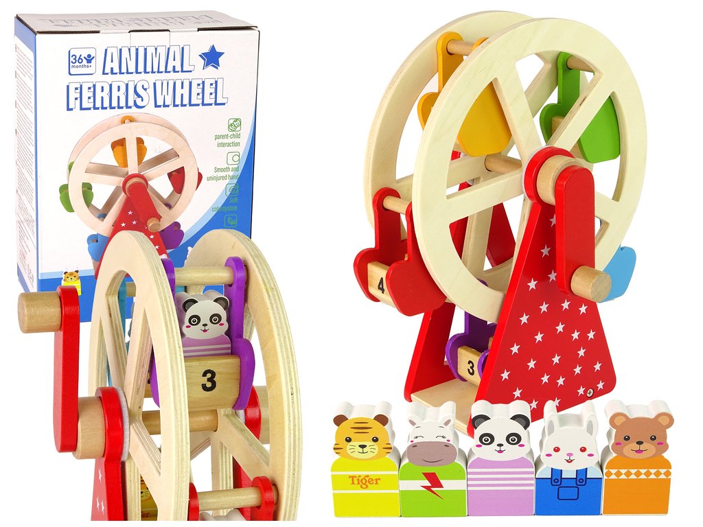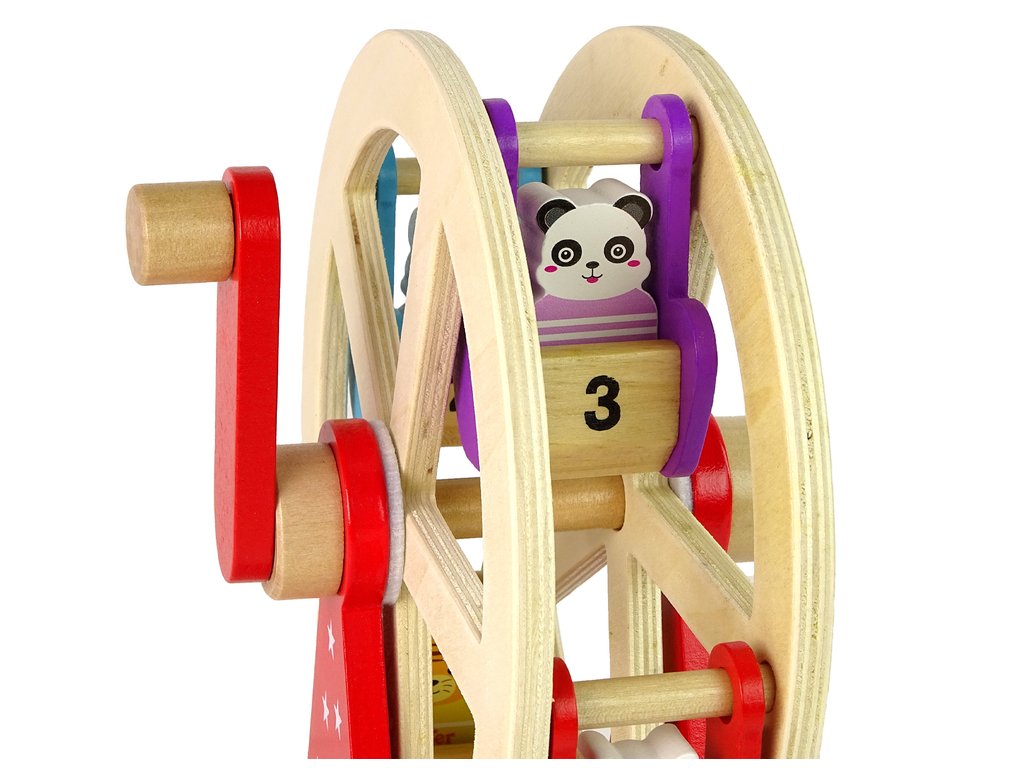 Колелото има дръжка отстрани, завъртайте я и наблюдавайте как колелото се върти около оста си. С пет животинчета, чакащи да се качат във вагончетата, всяко с номерация, детето ви може да направи първите си стъпки в броенето. Цветният дизайн грабва вниманието и стимулира играта.