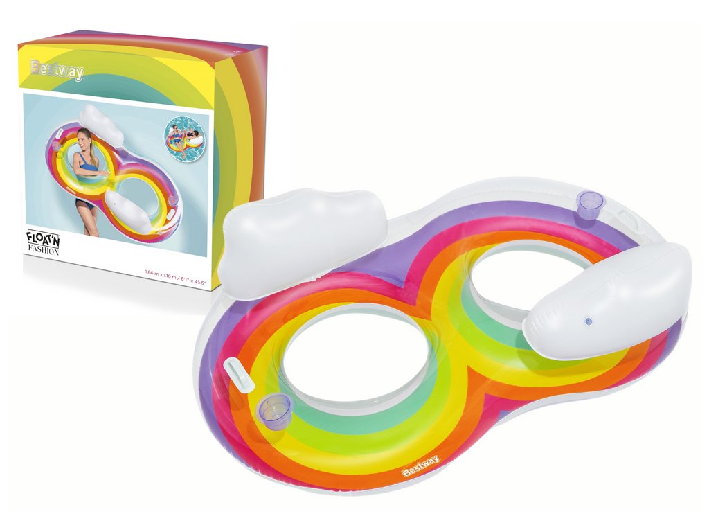 Двоен надуваем кръг Bestway 186 x 116 см дъгови цветове е предназначен за двама души. Интересният му дизайн ви позволява да споделяте приятни моменти с вашата любим човек. Изработен е от здрав PVC материал, устойчив на повреди и вредното слънчево излъчване. Разполага с вградени облегалки за глава и поставки за напитки.