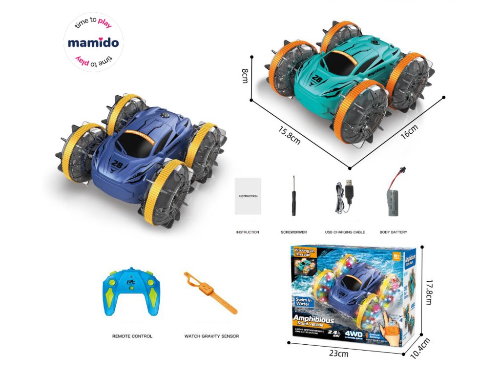 Изживейте адреналиново пътуване по суша и вода. Това амфибийно RC автомобил може да се движи по суша, пясък, трева и директно по водната повърхност. Благодарение на големите колела с издатини, то се движи лесно по всякакъв терен и може да изпълнява различни каскади.