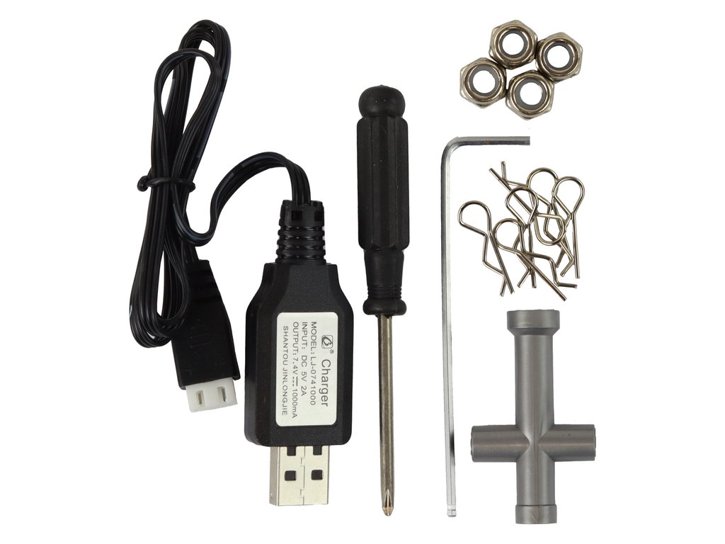 Радиоуправляемият джип разполага с акумулатор с голям капацитет 1400 mAh и USB зарядно, осигуряващи дълго време за игра и бързо зареждане.