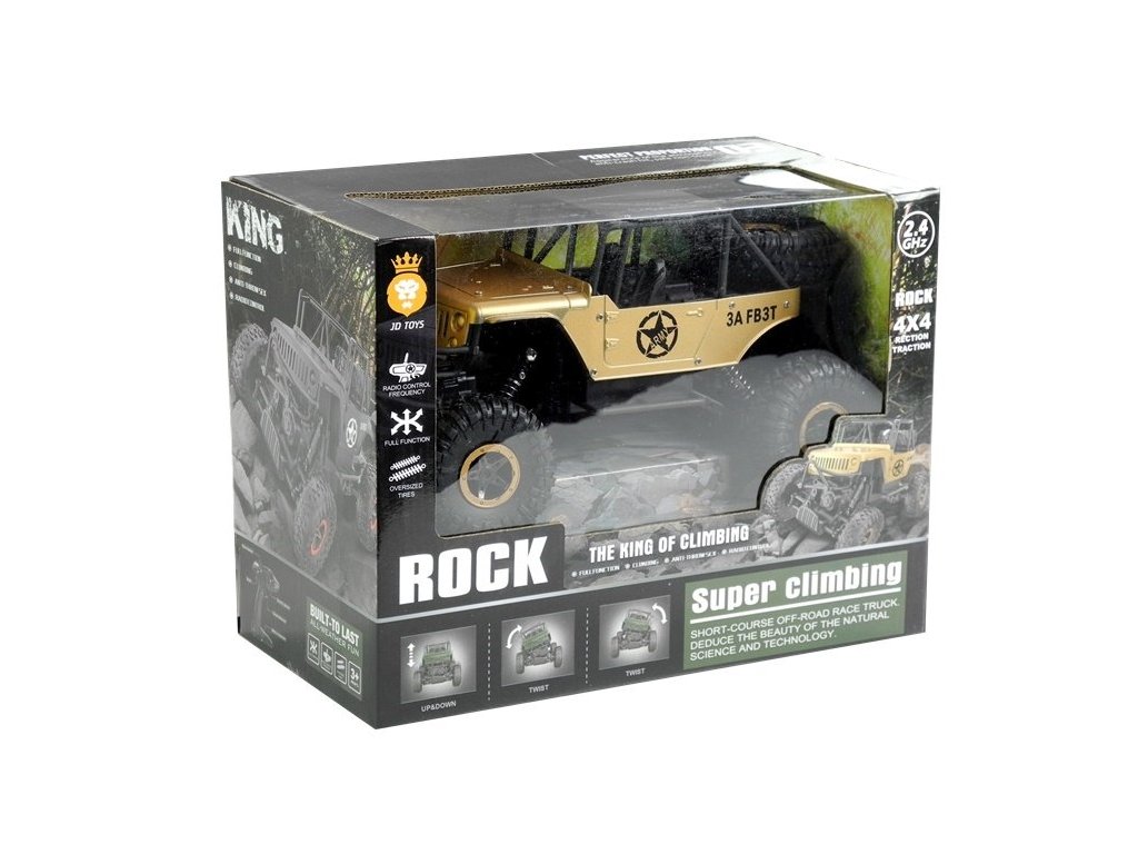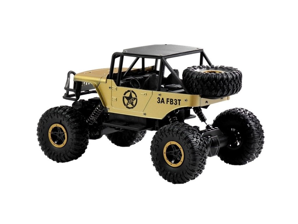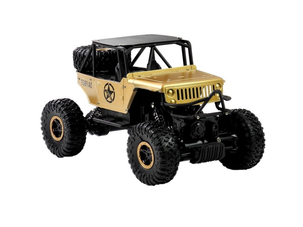 Джип с дистанционно управление R/C 1:18 златен е превозно средство, което гарантира на потребителя много забавление! Разполага с множество функции, които не се срещат при други модели дистанционно управлявани коли, като задвижване 4x4, амортисьори и функция завъртане. Високото окачване и големите гуми позволяват безпроблемно шофиране по неравни терени. Дистанционното управление е на честота 2,4 GHz и осигурява стабилна и постоянна връзка с автомобила.