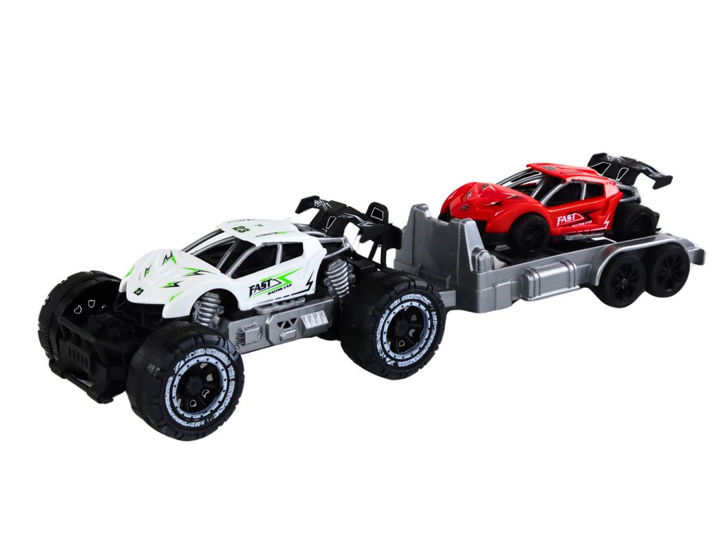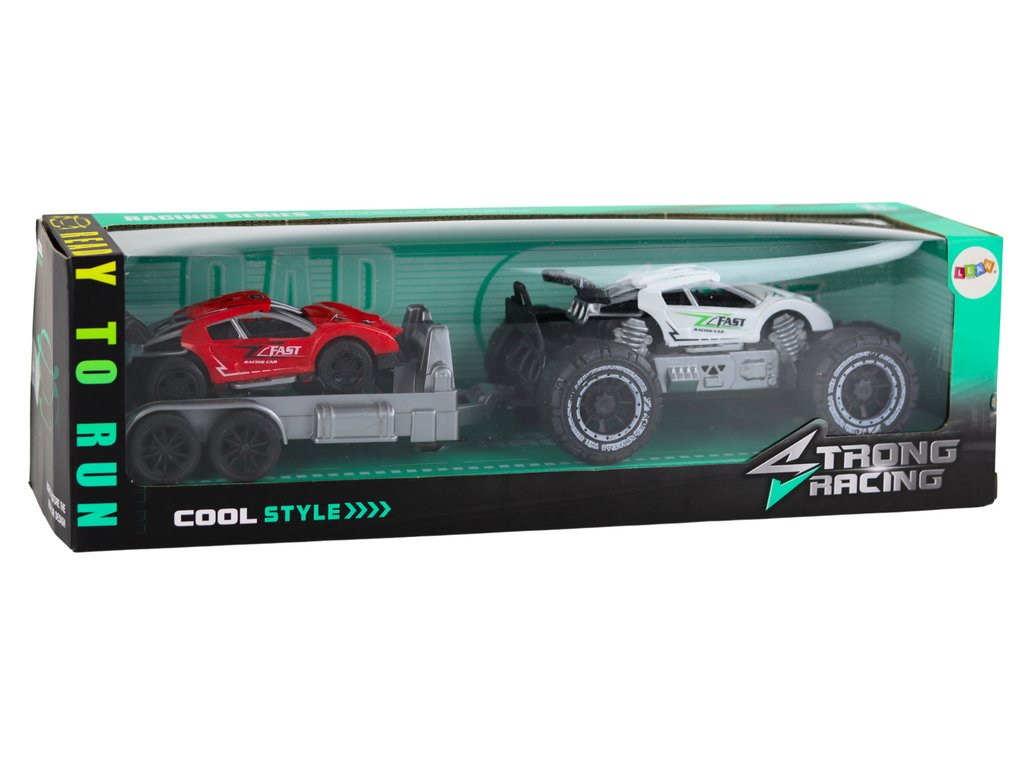 Към джипа е прикрепено ремарке с малка червена спортна кола, подготвена за нови предизвикателства. Това, което прави този комплект наистина уникален, е неговата гъвкавост. Ремаркето може да се откачи по всяко време от бялата кола, което дава възможност за създаване на по-сложни истории и стимулиране на детското въображение.