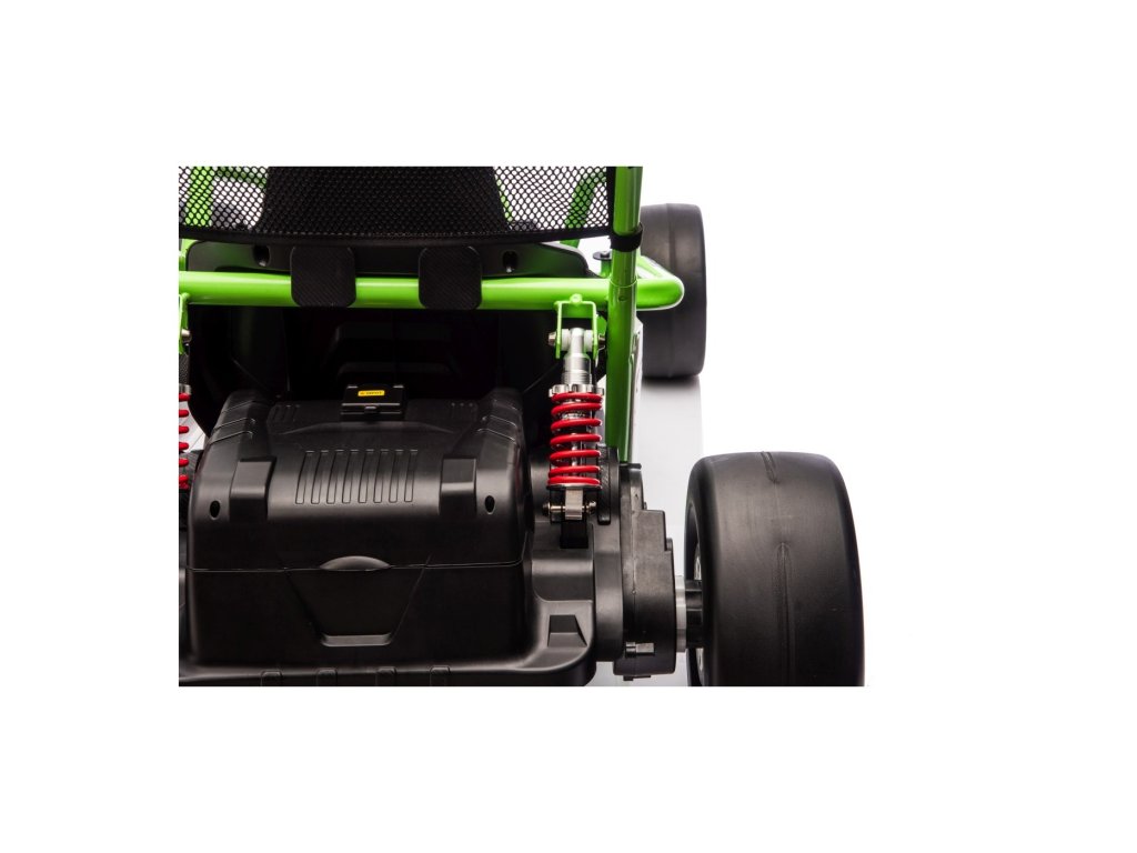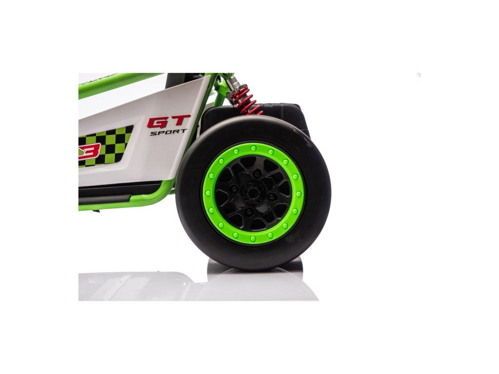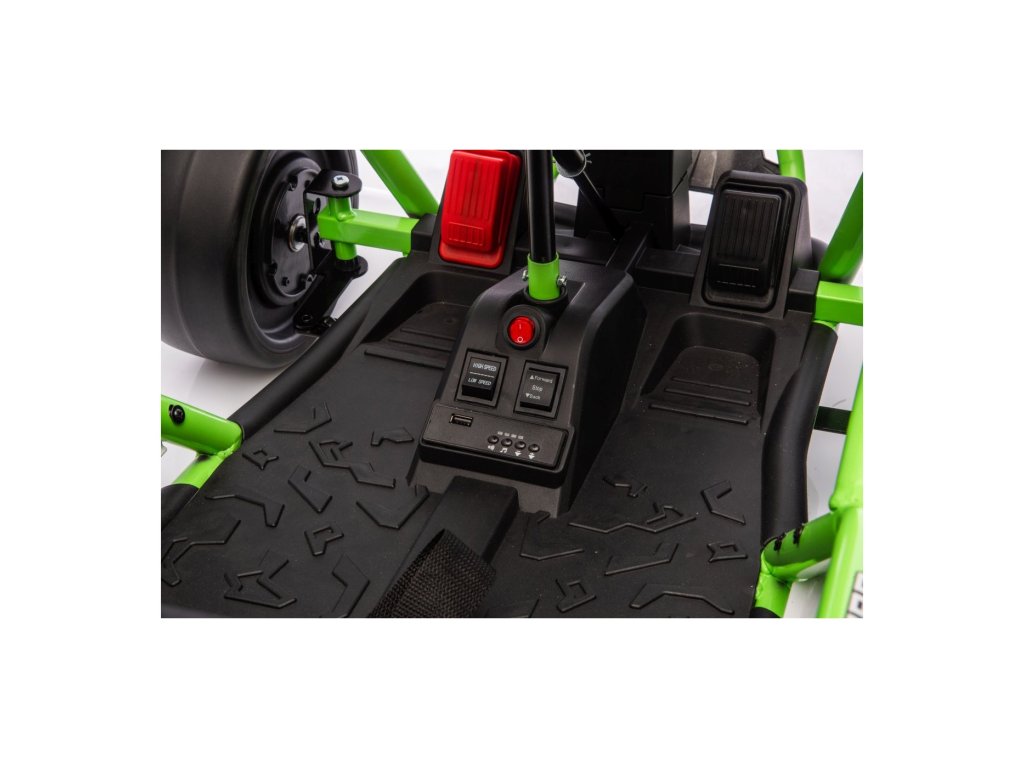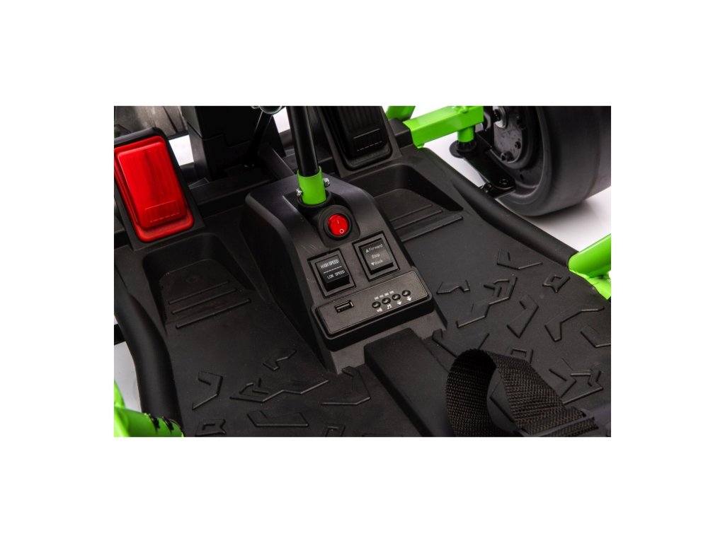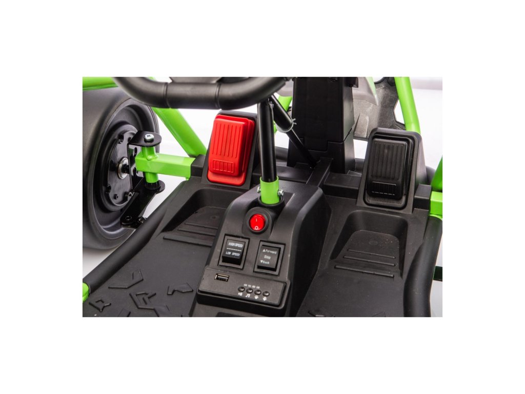 Картингът е оборудван с предни EVA колела за гладко возене, докато задните пластмасови колела позволяват лесно дрифтиране. Разбира се, има регулируеми задни амортисьори, плавен старт и предпазни колани за повече безопасност по време на шофиране. Всичко е допълнено от модерен аудио панел с Bluetooth и MP3 плейър.