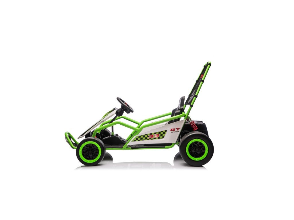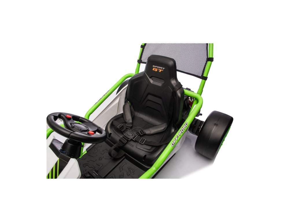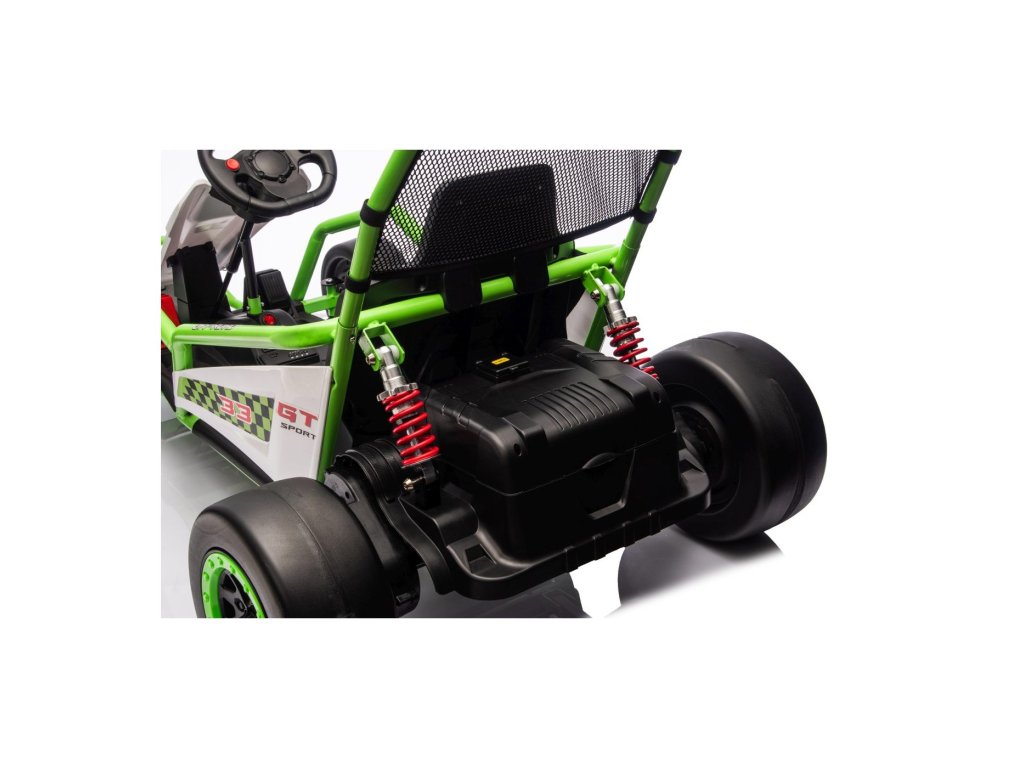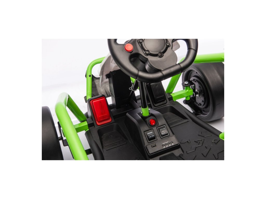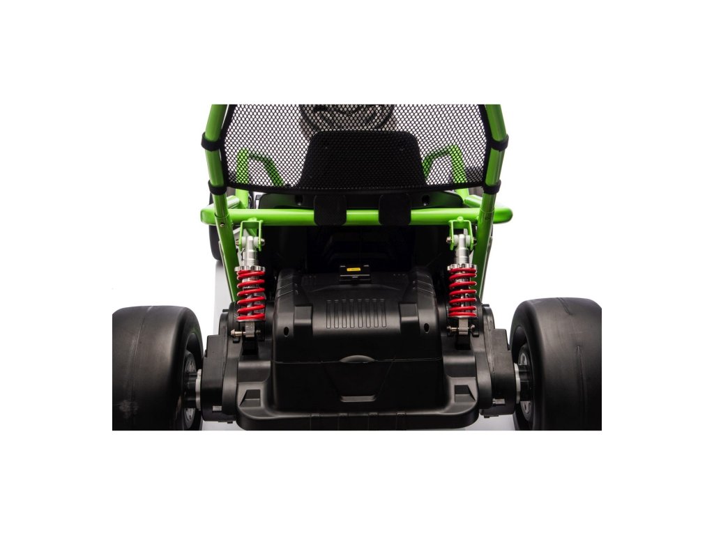 Картингът е оборудван с предни EVA колела за гладко возене, докато задните пластмасови колела позволяват лесно дрифтиране. Разбира се, има регулируеми задни амортисьори, плавен старт и предпазни колани за повече безопасност по време на шофиране. Всичко е допълнено от модерен аудио панел с Bluetooth и MP3 плейър.
