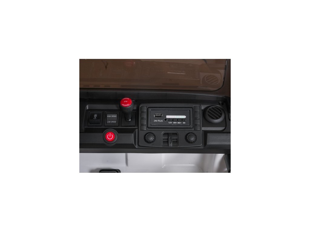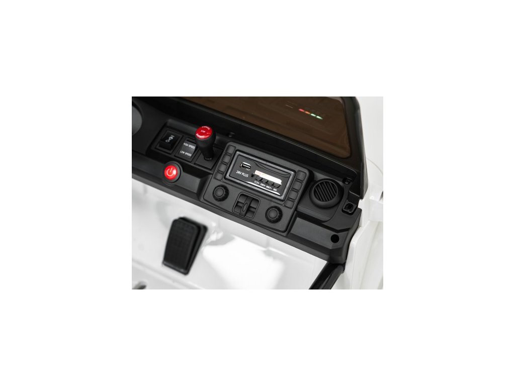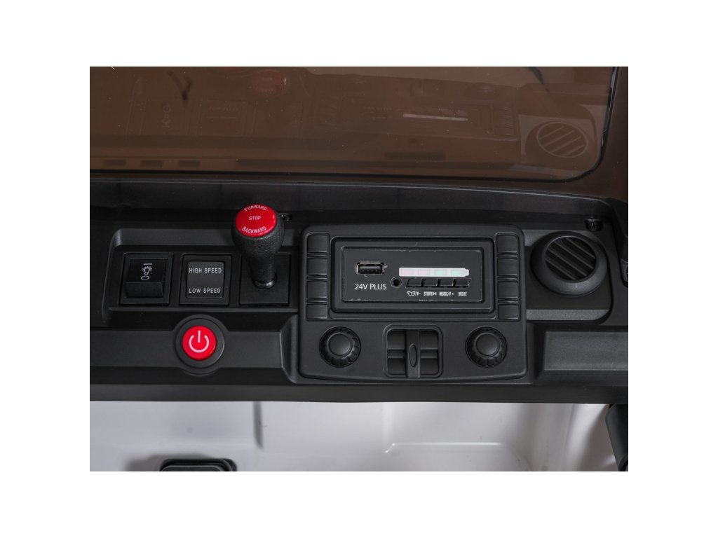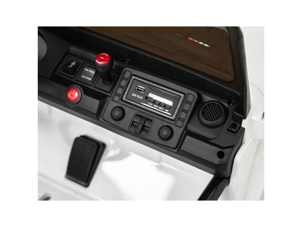 Можете да управлявате колата с помощта на дистанционно управление, което работи на честота 2,4 GHz. На дистанционното управление има три скорости и бутон за безопасност STOP, който спира колата веднага след натискане. Седалката е покрита с екологична кожа и има предпазни колани.