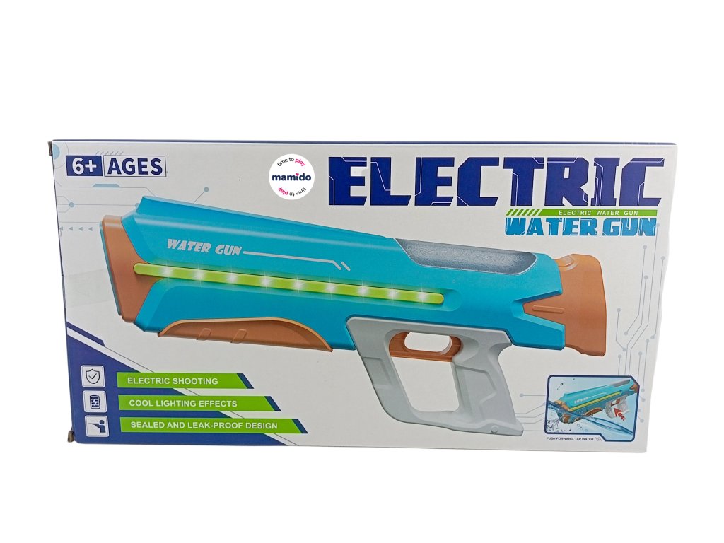 Подгответе се за освежаващо лятно забавление с електрически воден пистолет! Благодарение на автоматичното стрелба, цветното LED осветление и уплътнената конструкция срещу изтичане на вода, този пистолет е идеален избор за всички малки и големи бойци. Предлага силна струя вода без необходимост от ръчно помпане, така че просто натиснете спусъка и действието може да започне!