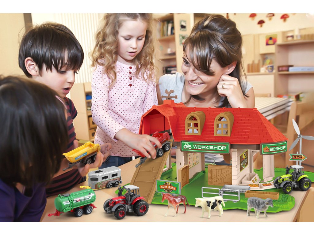 - Пълен комплект: Включва трактори, ремаркета, животни (крави, коне, овце и други), кошара и допълнителни аксесоари, които обогатяват играта.