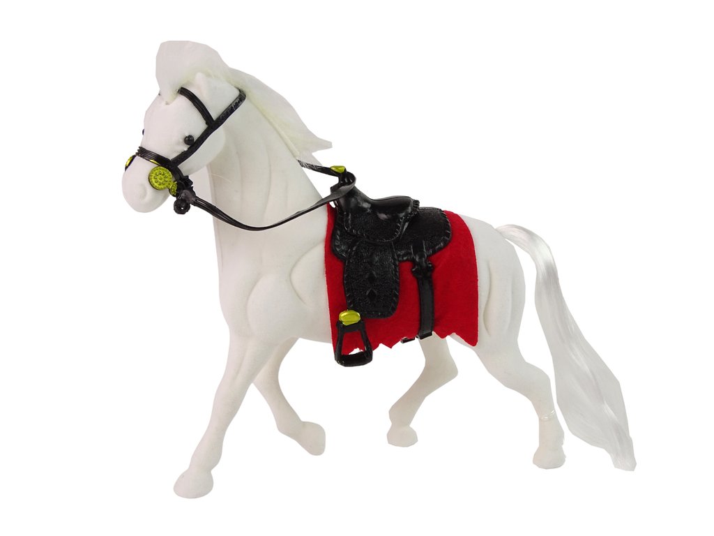 Размерът на модела е идеален за малки детски ръчички. Фигурата вярно пресъздава реалния външен вид на животното. Комплектът включва бяла, на допир мека фигура на кон с черно седло и червена шапчица, което я прави чудесно допълнение към вашата колекция.