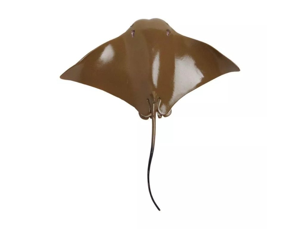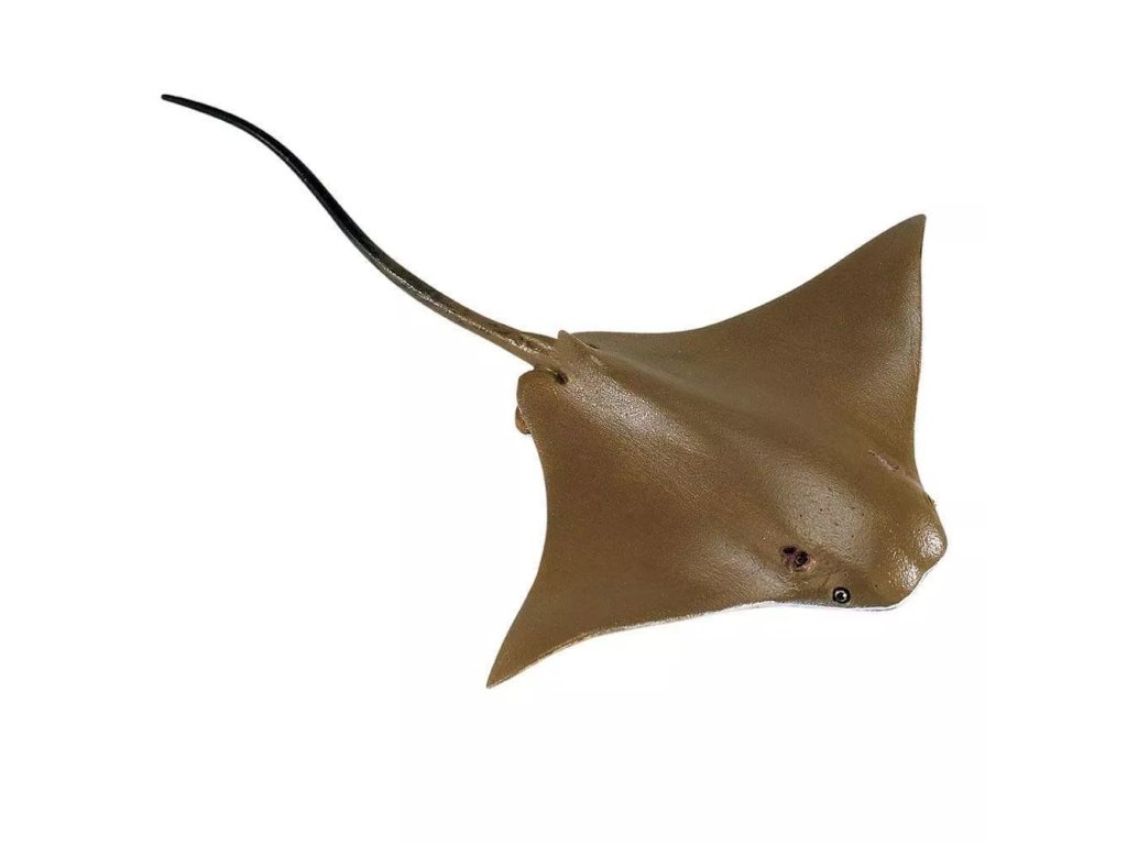 Модел на скат, изобразяващ воден животин с ромбовидно, сплескано тяло, което му позволява да се слее с морското дъно, да дебне плячка и да се крие от хищници. Фигурката е допълнена с информация за поведението на вида и неговото разпространение.