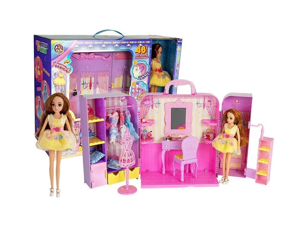 Голямо предимство на нашия гардероб за кукли с аксесоари е, че разполага със светлини, които осветяват beauty ъгъла. Освен това можете да променяте ъгъла на насочване на малките прожектори. Множество бляскави аксесоари и имитации на козметични продукти Ви позволяват да подготвите куклата за игра от началото до края с най-малкия детайл.