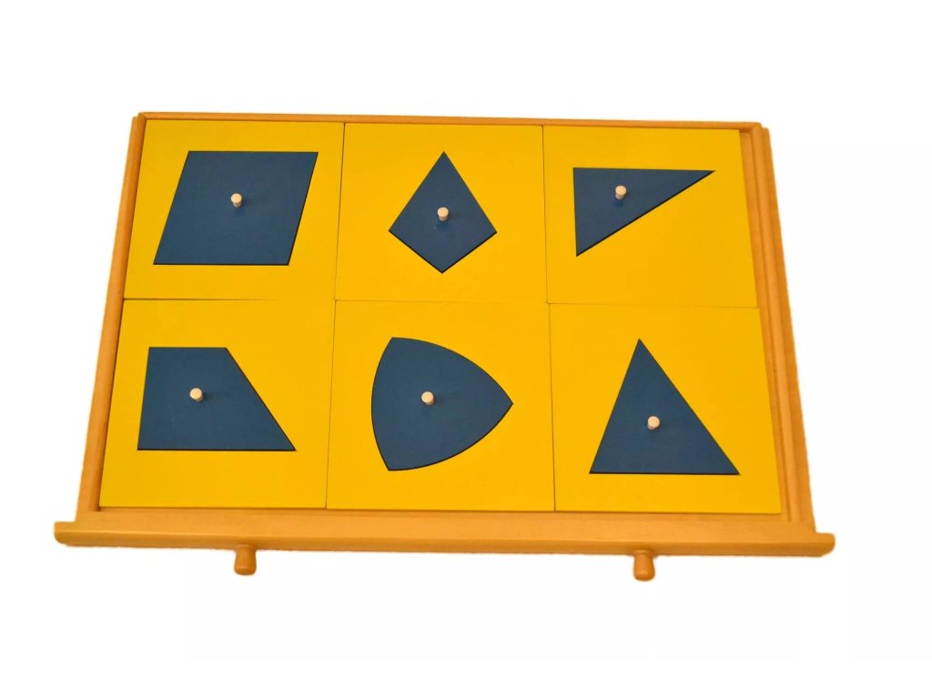 Montessori помагалото съдържа 6 чекмеджета с 35 равнинни форми по двойки: форма и съответстваща рамка. Всяка форма има дръжка в средата за по-лесно боравене. Презентационният поднос съдържа три основни форми: триъгълник, кръг и квадрат.