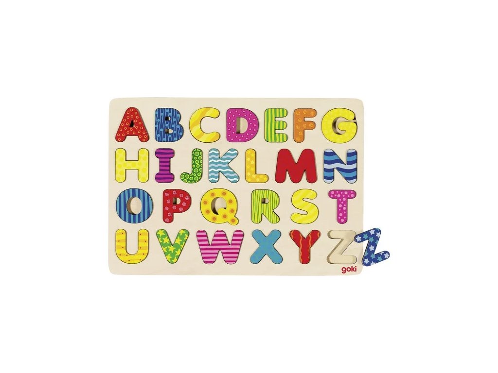 Пъзел азбука от работилницата на любимата марка Goki съчетава забавление с учене на букви чрез вложки от дървени части.