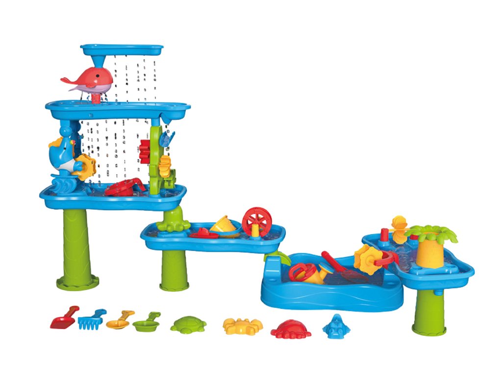 Водният парк разполага с множество интерактивни елементи, които със сигурност ще стимулират любопитството на всяко малко дете. В комплекта ще откриете водни мелници, които се въртят при контакт с вода и създават завладяващи ефекти, както и гребла, лопатки и кофички, които подпомагат изследването на природата. Допълнително, формичките позволяват създаване на най-различни фигури от пясъка, развивайки фината моторика и въображението на детето.