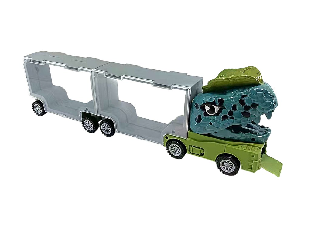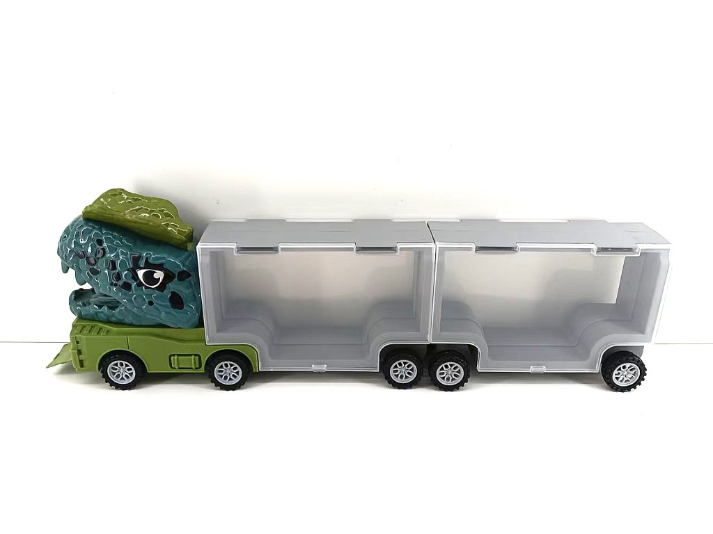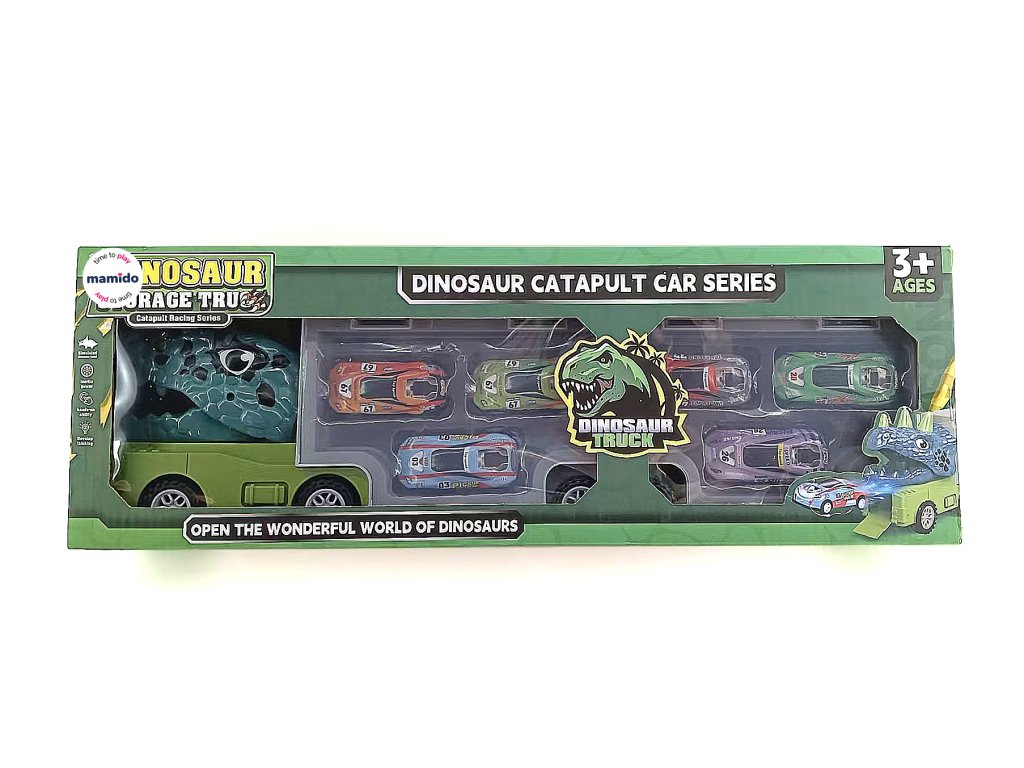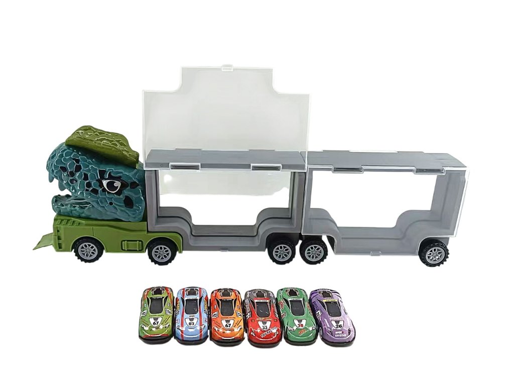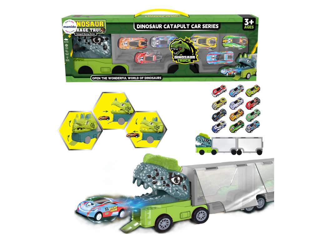 Dino Truck е уникална камион, която съчетава кутия за съхранение на колички и катапулт във формата на динозавър. Просто поставете количката в устата на динозавъра, натиснете и я изстреляйте напред – забавлението за дълги часове е гарантирано! Камионът служи и като практична чанта за пренасяне и съхранение на всички колички.