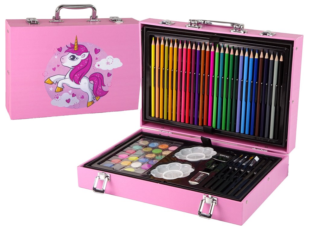 Развихрете детското въображение и творческите умения с нашия Голям художествен комплект в куфар 145 елемента розов. В комплекта децата ще намерят всичко необходимо – флумастери, пастели и акварелни бои. Комплектът е опакован в удобен куфар, който лесно се сгъва, затваря и пренася – идеален за училище, детска градина, арт уроци или разходка. Този художествен комплект е подходящ не само за деца.