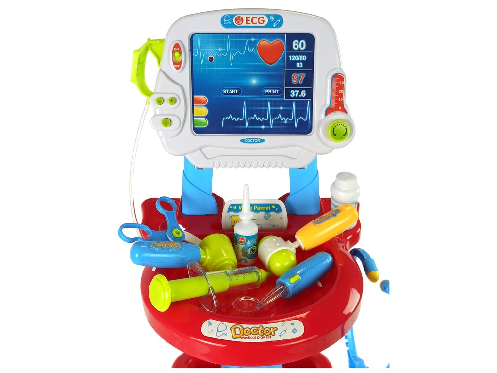Комплектът включва стабилна количка с четири колела, дръжка, две отделения за медицински принадлежности и табло. ЕКГ е перфектен за бъдещи малки лекари.