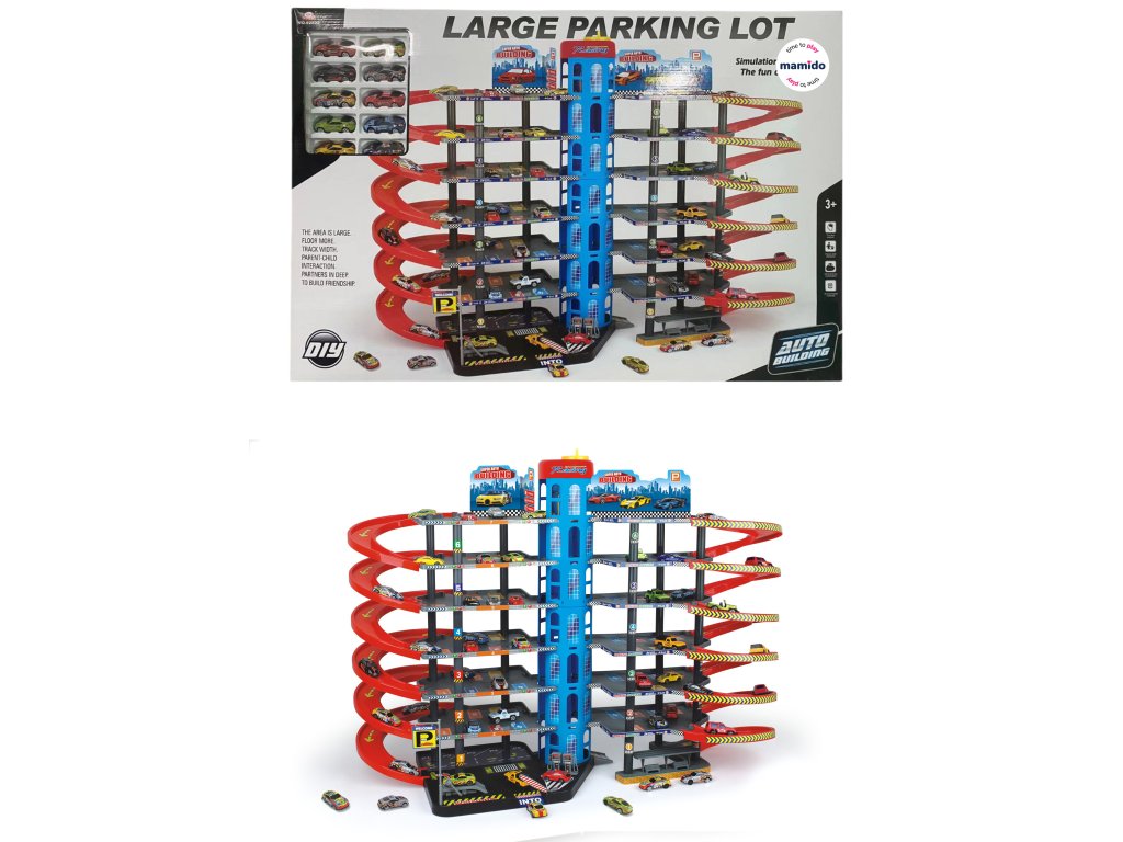 Голям многоетажен паркинг комплекс предлага на децата свят, изпълнен с колички, рампи, спускания и забавни игрови сценарии. Този многоетажен паркинг предлага няколко нива за паркиране, висока централна кула и дълги спирални спускания, които позволяват на децата да пускат количките отгоре надолу. Включени са също малки колички и аксесоари за реалистична игра.
