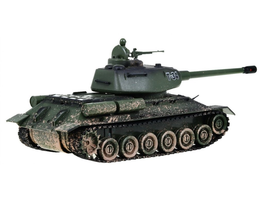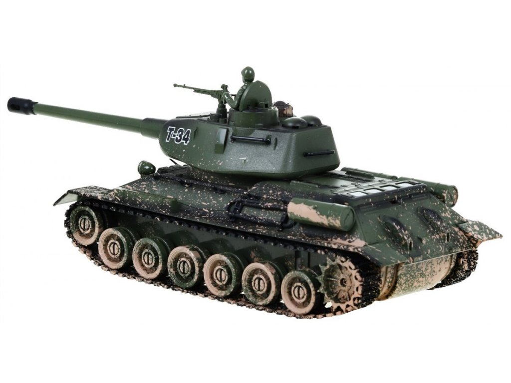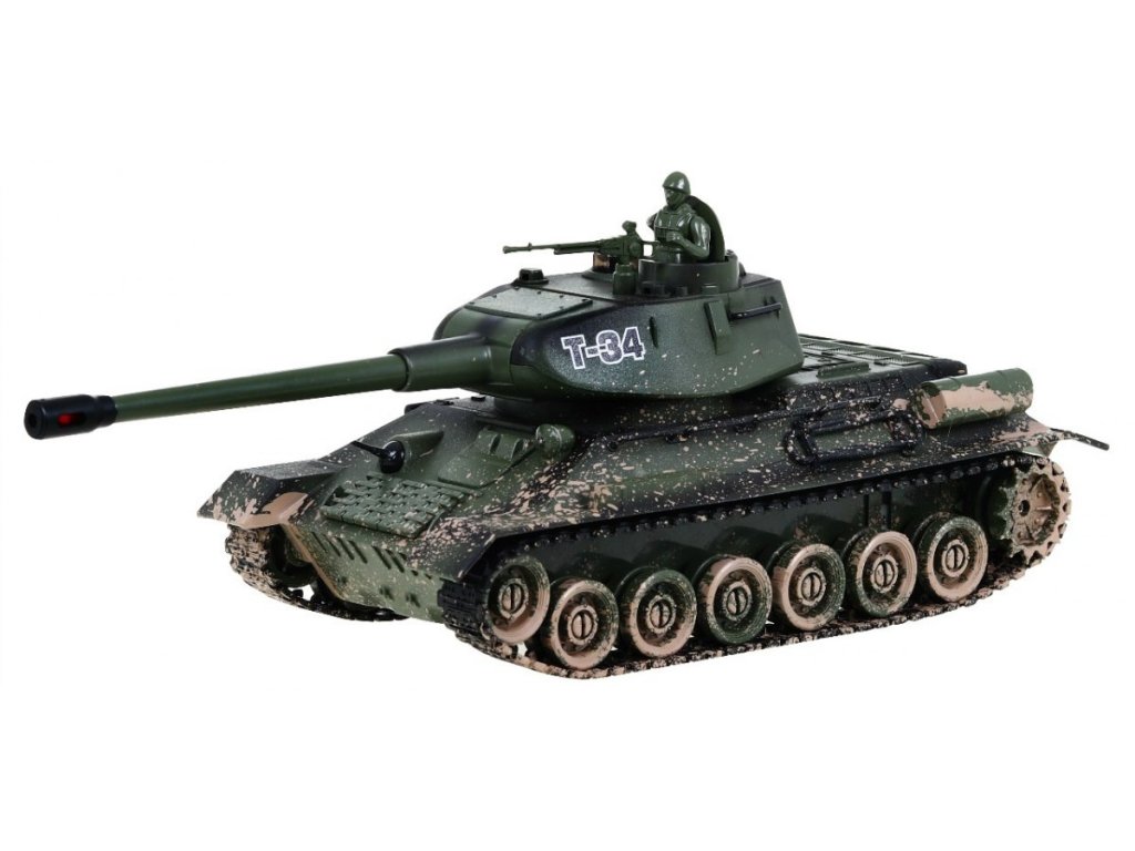 Голям танк T34 R/C 1:28 с честота 2,4 GHz, която няма да ви пречи при игра с други играчи. След насочване и изстрелване на точен снаряд към другия модел, ще чуете реалистичен звук на попадение.