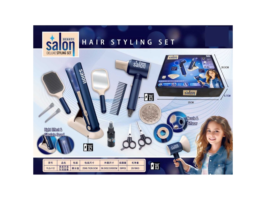 Сешоарът издухва въздушна струя. Разполага с двустепенна регулировка на въздушния поток и при съхнене издава звуци като истински. Пресата за коса има светлинни ефекти и звуци, имитиращи изправяне на коса. Сешоарът работи с 3 батерии AAA 1,5 V (не са включени в комплекта), а пресата с 2 батерии AAA 1,5 V (не са включени в комплекта).