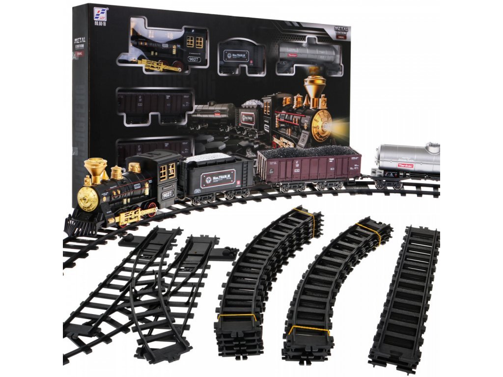 Голяма железопътна линия с парен локомотив и реалистични звуци. Локомотивът изпуска дим от комина по време на движение (за да се образува пара, първо капнете малко вода в локомотива; в комплекта е включена пипета). По време на движение светлината в предната част на локомотива се включва. Железопътната линия е с елипсовидна форма с размери 213 x 106 см.