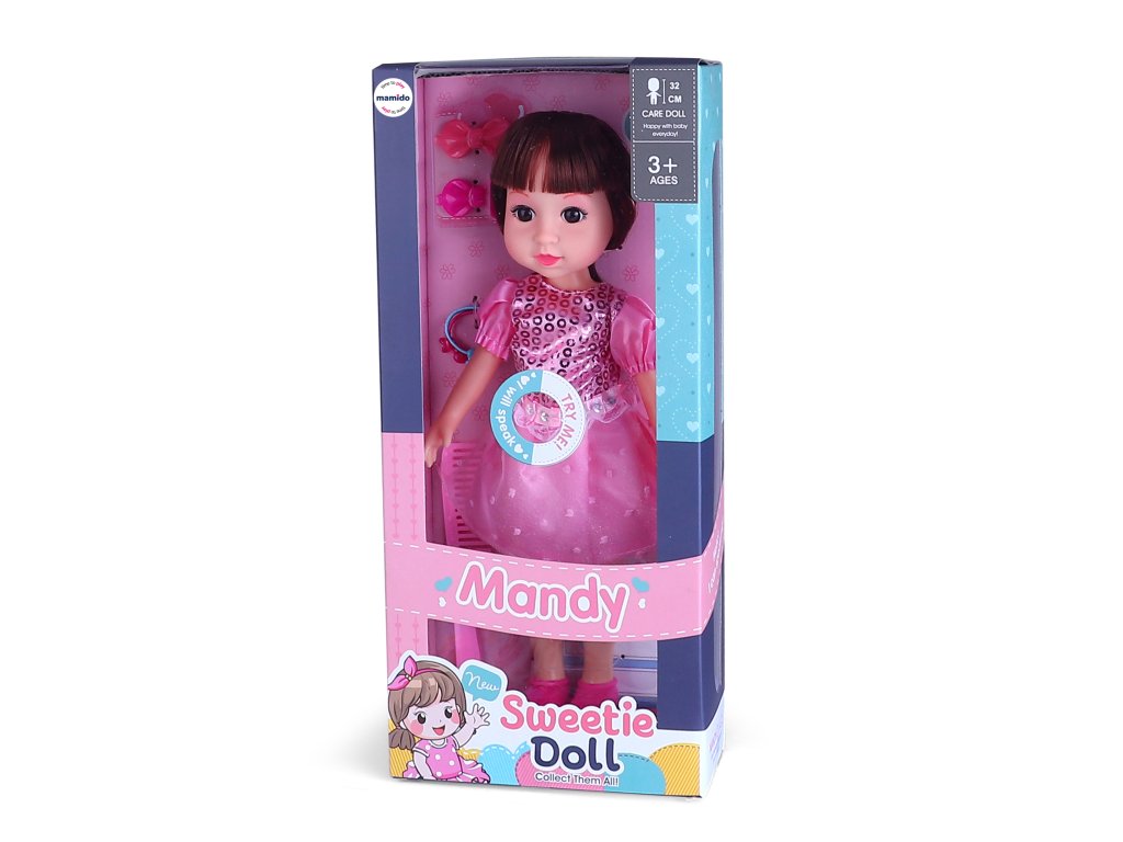 Сладката кукла Манди с височина 32 см ще зарадва всяка малка принцеса. Куклата е облечена в розова рокля и комплектът включва и малки аксесоари за разресване и украса. С натискане на бутона куклата говори, което прави играта още по-забавна и интерактивна.