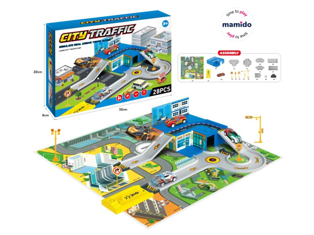 Отправете се към оживен град, пълен с пътища, завои и мостове! Този комплект за игра предоставя на децата възможност да изградят свой собствен център за движение с пътища, гараж и елементи за движение. Комплектът включва и игрална подложка, която прави сцената да изглежда още по-реалистична. Идеален за малки фенове на коли и игри с движение.