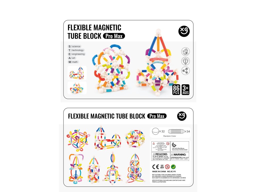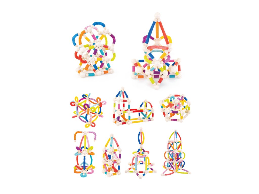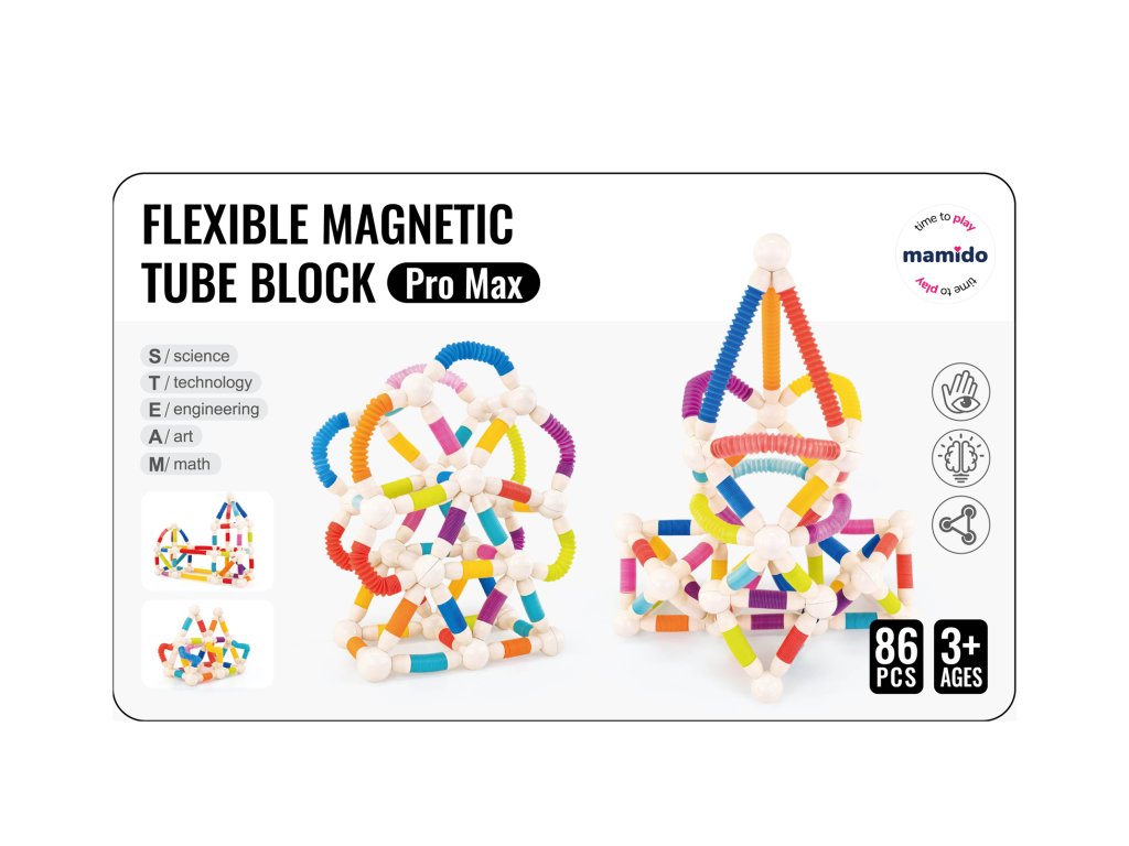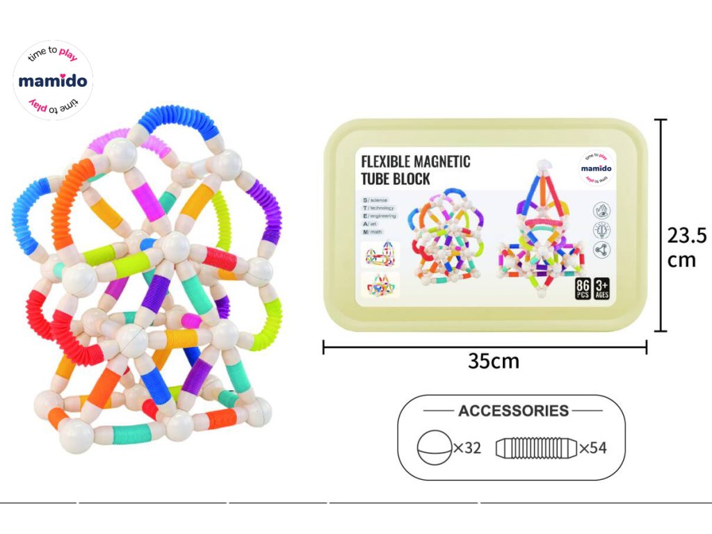 Комплектът съдържа 86 части, които включват гъвкави тръбички и кръгли магнитни съединители. Децата могат да създават топки, кули, мостове, футуристични обекти или оригинални форми според собственото си въображение. Благодарение на лесното свързване, комплектът е подходящ за деца от 3 години и чудесно подкрепя принципите на "STEAM” – наука, технологии, инженерство, изкуство и математика.