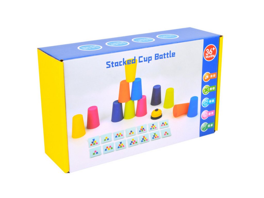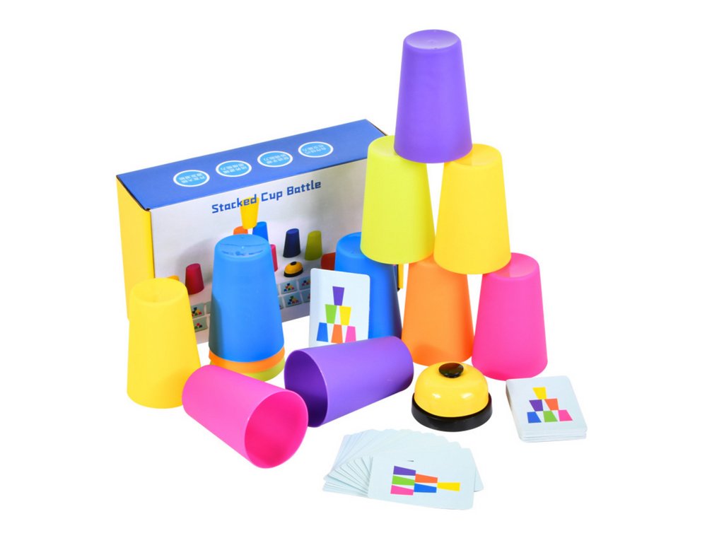 Състезавайте се в скорост и умение с играта с чашки за умения, която комбинира логическо мислене и рефлекси. Задачата на играчите е да подредят цветните чашки според образците на картите и първи да позвънят на звънеца.