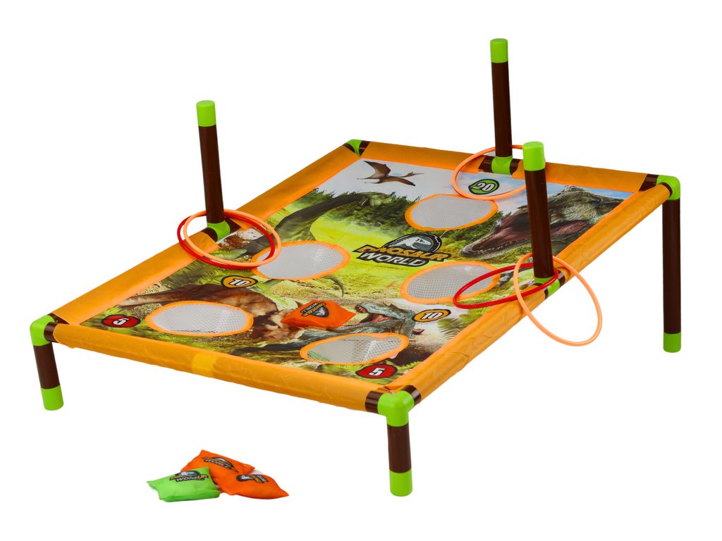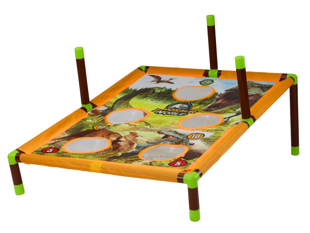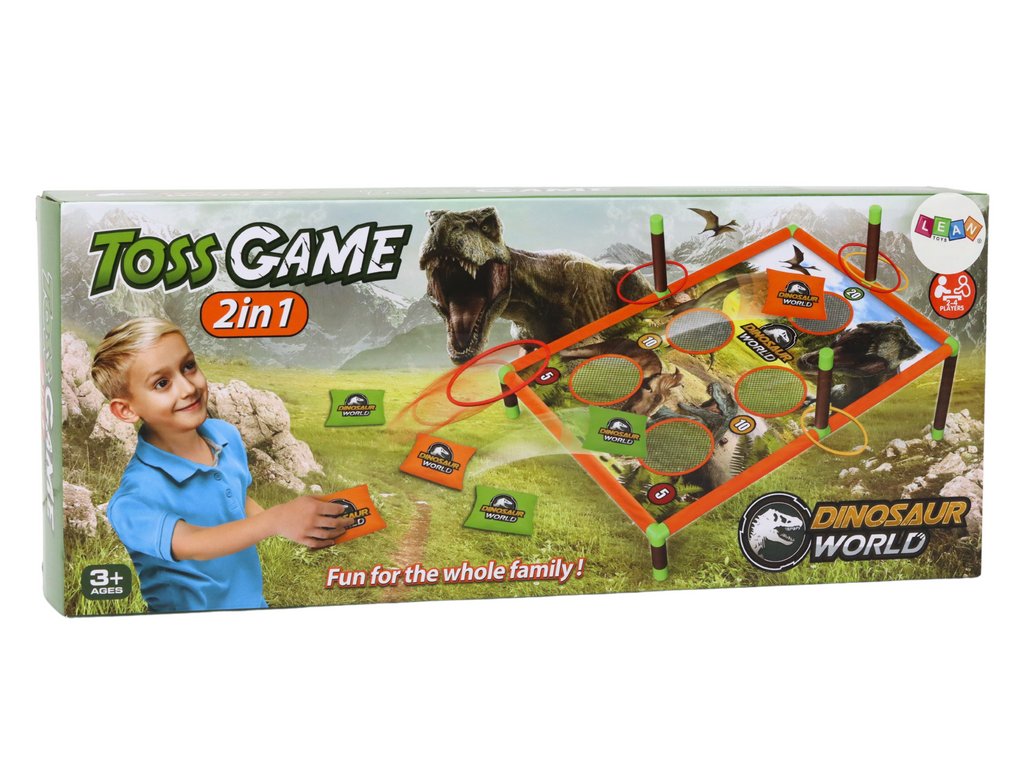 Играта се състои от здрава и цветна дъска, украсена с изображения на различни динозаври, която не само подтиква към забавление, но и стимулира детската фантазия. Дъската разполага със система за отбелязване на точки, което добавя елемент на състезателност и вълнение по време на игра. В комплекта ще намерите и специално проектирани чували за хвърляне, които осигуряват стабилност и точност при хвърляне, както и пръстени.