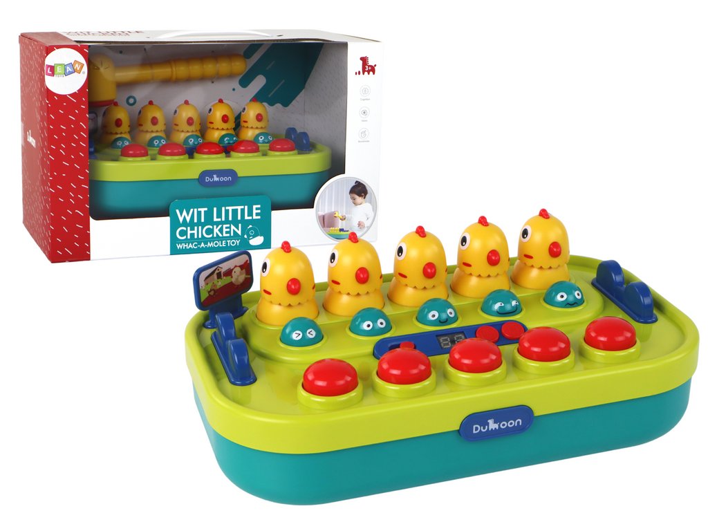 Вашата задача е с чукчето да удряте светещите бутони, което активира движението на пиленцата и натрупването на точки. Таблото показва броя на спечелените точки, а темпото на играта се увеличава с напредъка ви. Ако имате нужда от пауза, играта позволява пауза или рестарт чрез двата червени бутона, което осигурява повече гъвкавост и удобство по време на забавлението. В комплекта е включено жълто чукче, което при разтърсване издава звук на пиленце, добавяйки още повече настроение по време на игра.