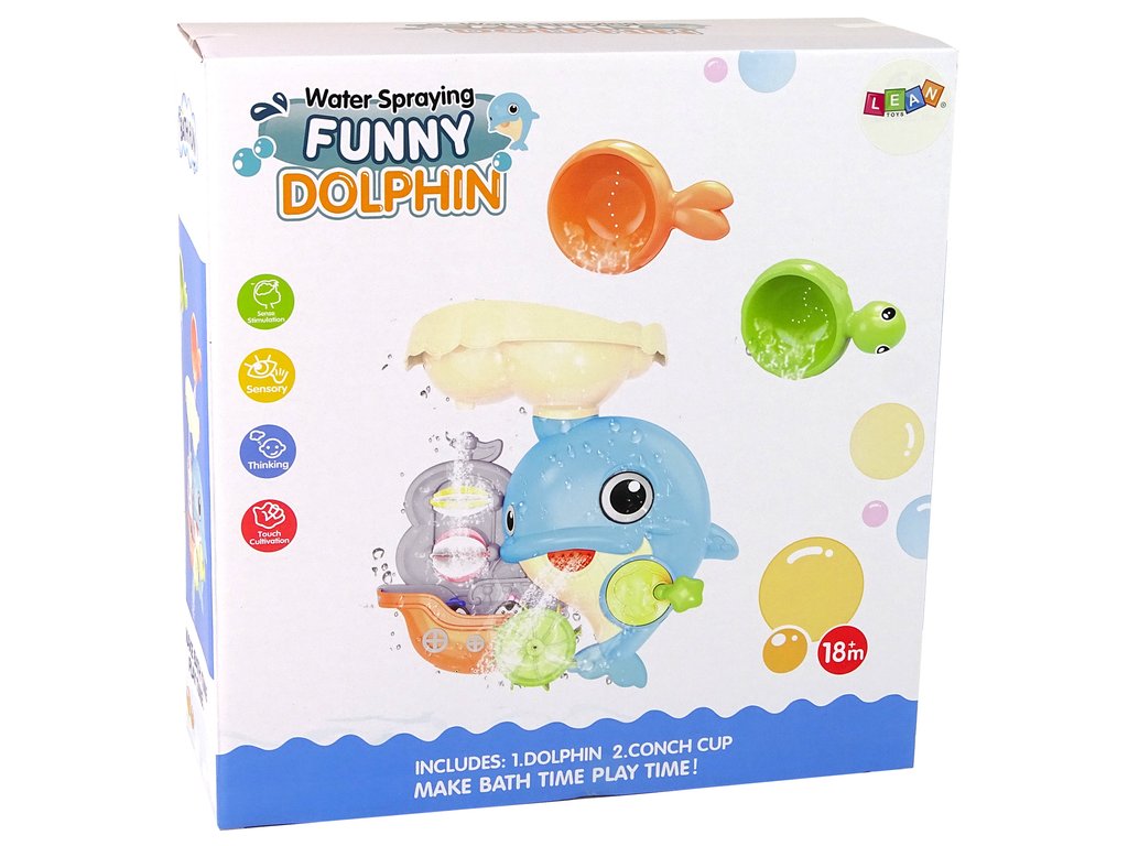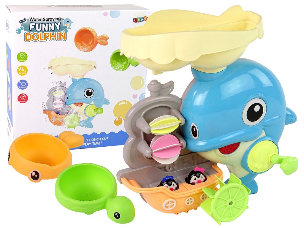 Големият делфин създава великолепен водопад под въздействието на водата. Първо набавете вода с черпачки във формата на костенурка и рибка, след което я изсипете в контейнера над главата на делфина. Под струята вода се образува прекрасен водопад, но това не е всичко.