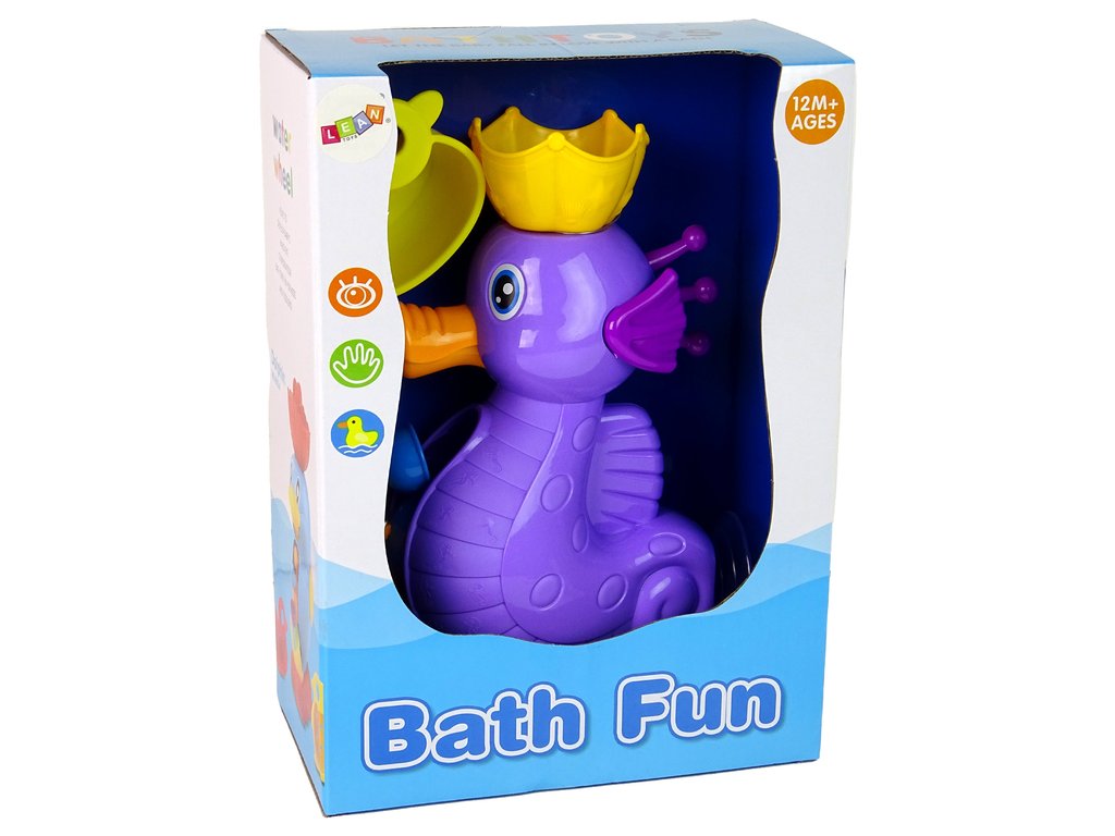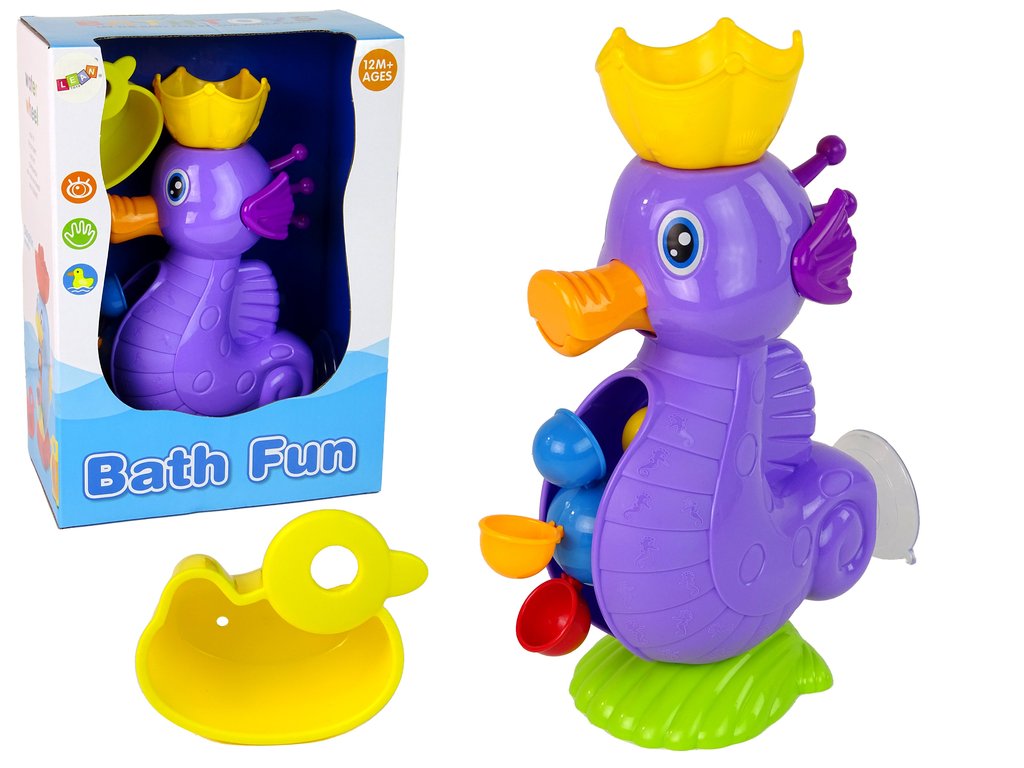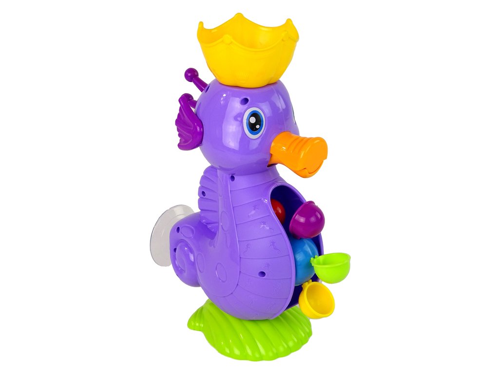 Под въздействието на водния поток, Играчка за къпане Морски кон Проточен душ създава прекрасен водопад. Първо напълнете вода с помощта на какъвто и да е черпак и след това я излейте в съда над главата на морския кон. От устата му изтича вода, която задвижва малко водно колело.