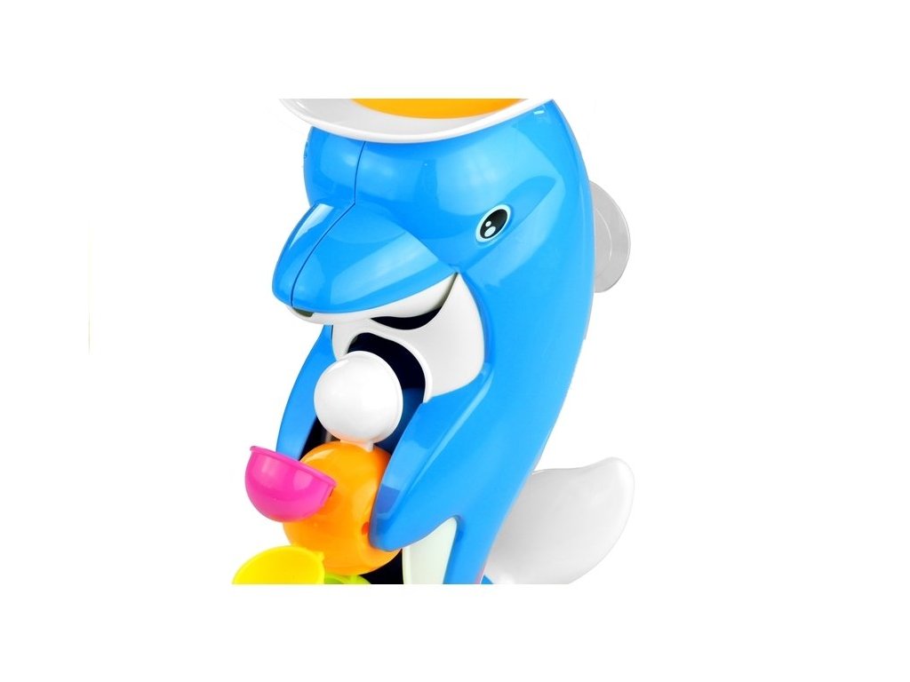 Делфинчето е декорирано с бели детайли, шапка и въртящ се елемент. Играта е поставена върху основа, която осигурява стабилност. На гърба има вакуумна вендуза, която позволява играчката да се закрепи върху банята или плочките в банята.