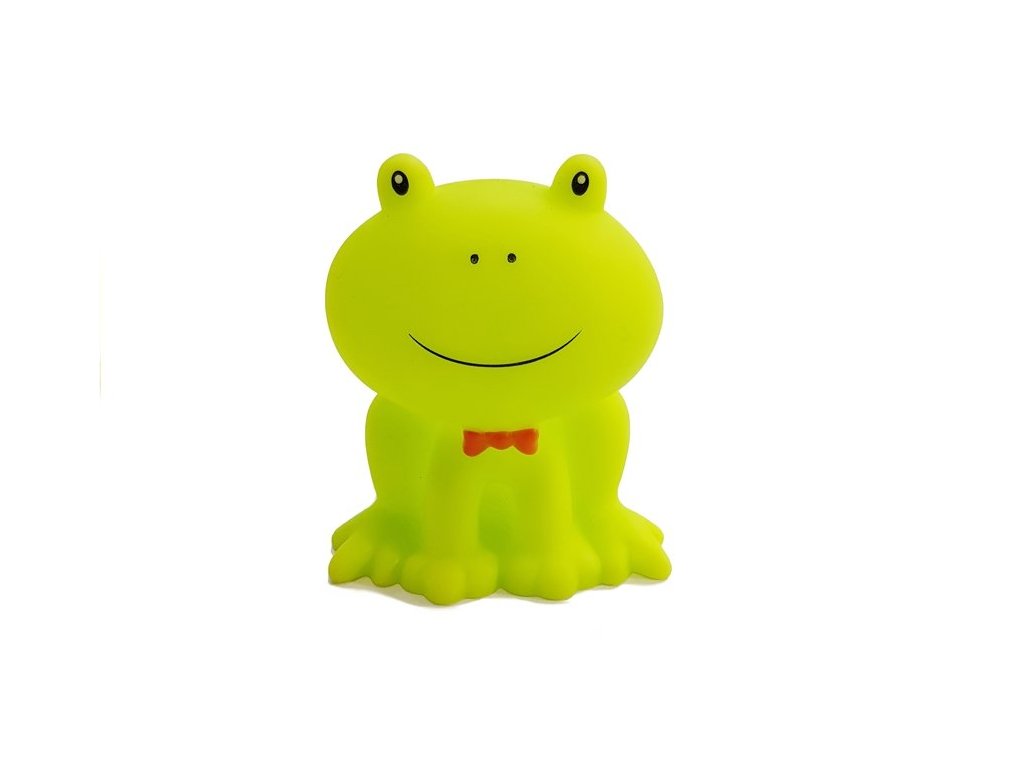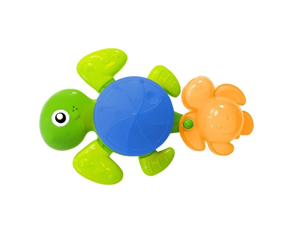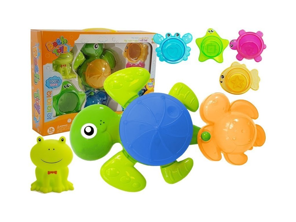 Комплектът съдържа още зелена жабка, която издава пищящ звук при натискане, и голяма костенурка, която се движи във водата и създава ефект на водопад. Този цветен комплект допълнително развива фината моторика, тактилното възприятие и учи детето да разпознава цветове и форми.