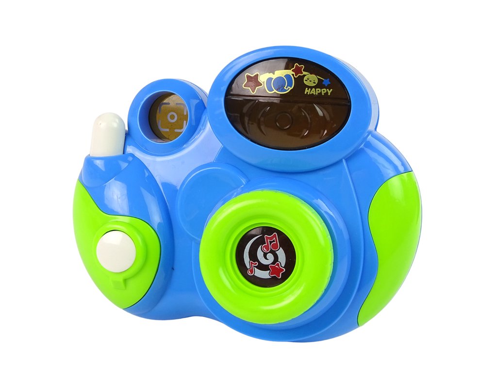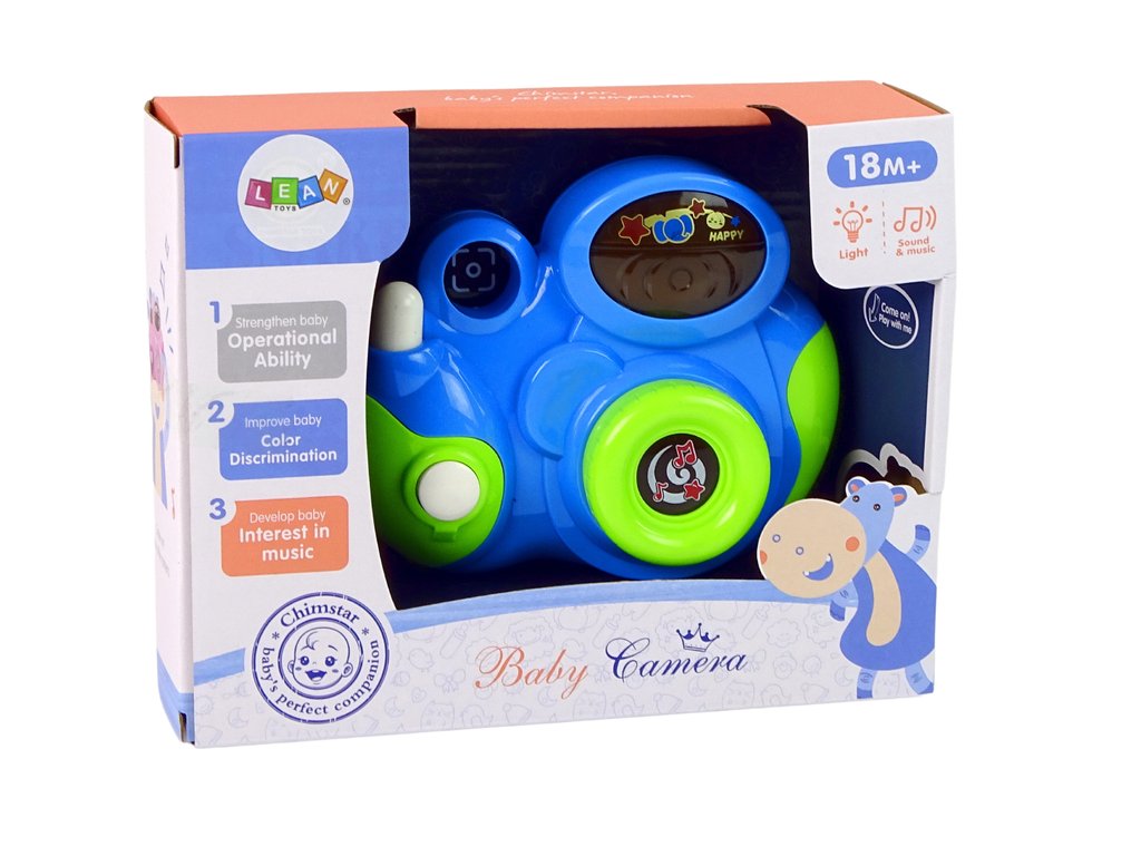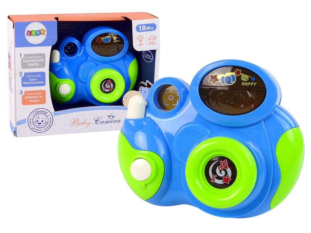 Има автентични звуци на фотоапарат: издава звук „щрак“ като истински фотоапарат. Разполага с 3 мелодии при натискане на бутоните, както и цветни светлини за симулация на светкавица. Интерактивният фотоапарат развива координацията око-ръка на вашето дете.