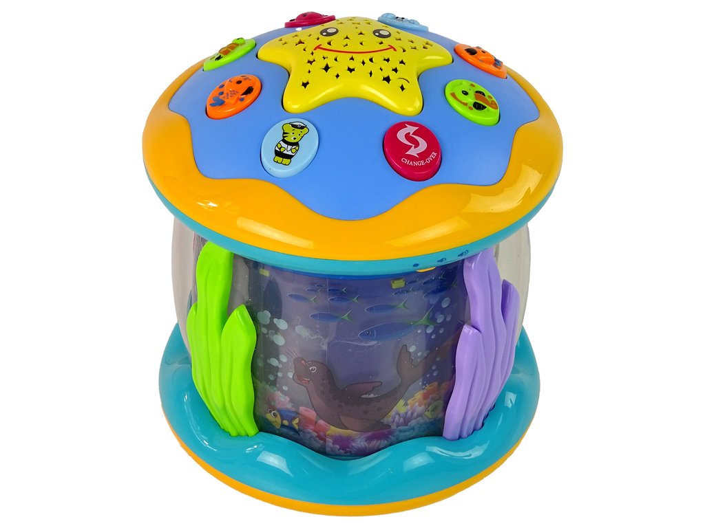 Интерактивният проектор на звезди, комбиниран с нощна лампа, е идеалният подарък за вашето дете. Перфектно се вписва в детската стая. Успокоява вечер и гарантира спокоен сън. Вашето малко може да използва проектора и през деня – играчката разполага с множество цветни бутони, които издават звуци и мелодии. Трислойната движеща се и осветена графика с морски мотиви със сигурност ще привлече вниманието на вашето малко съкровище.