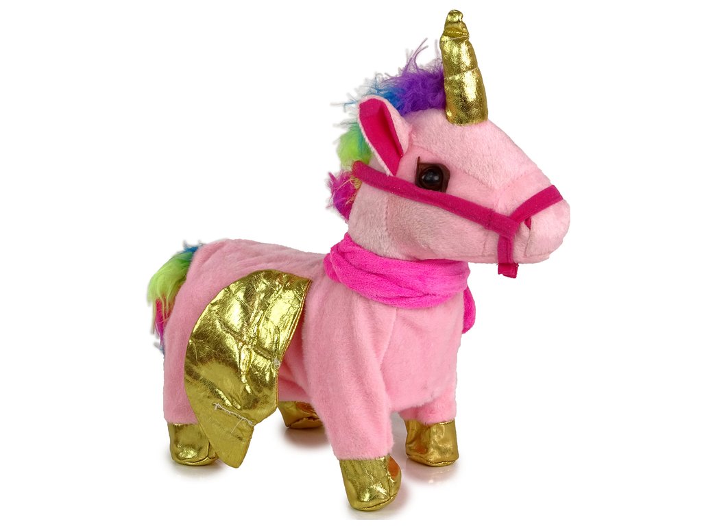 Интерактивен розов еднорог с крила е създаден с изключителна грижа, има розов цвят, златни крила и цветна грива, мек на допир. Еднорогът ръмжи и свири кантри мелодия. След поставяне на батериите, натиснете дръжката на повода и еднорога ходи, движи опашката и главата си.