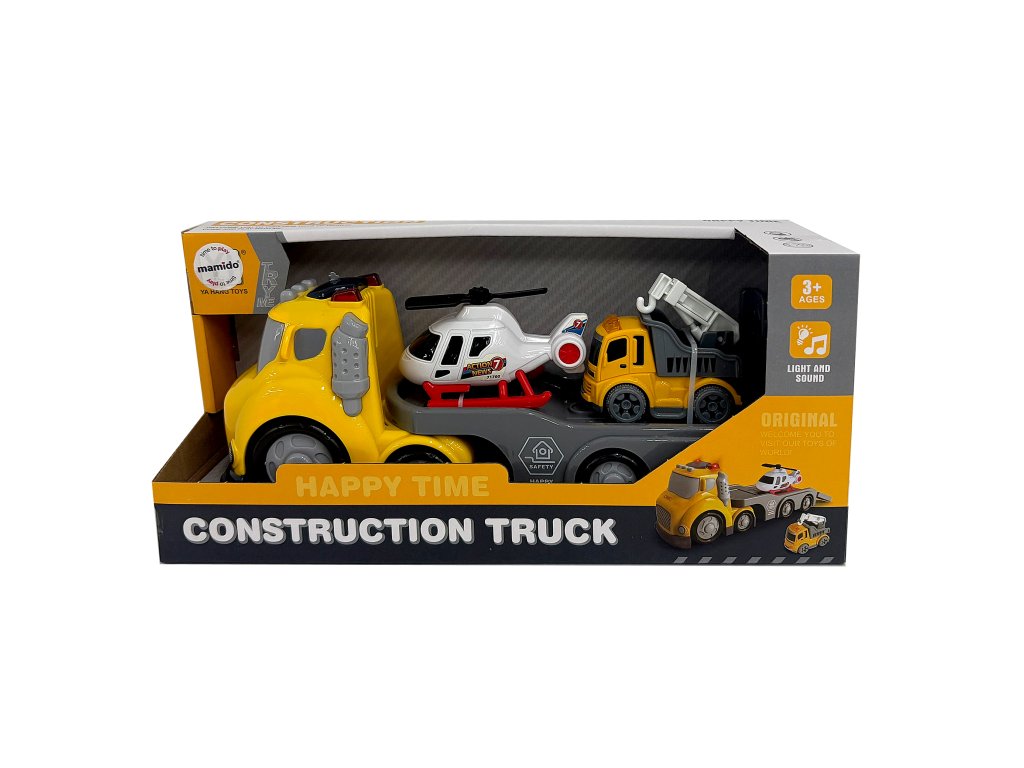 Забавният комплект за малки фенове на строителни и спасителни машини! Голям жълт влекач с ремарке превозва хеликоптер и самосвал, така че децата могат да играят на строителна площадка и спасителна акция. Моделът е допълнен със светлинни и звукови ефекти, които оживяват играта още повече.