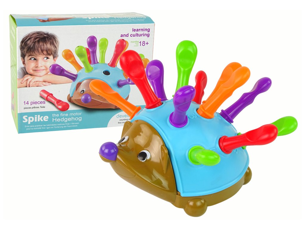 Особеността му са сините бодли, които децата могат сами да закачат. В комплекта са включени 12 пластмасови бодли, които се поставят в кръглите отвори на таралежа. Това представлява не само предизвикателство за малките пръстчета, но и отличен начин да се научат да броят от 1 до 12, тъй като на таралежа са изобразени и съответните цифри.