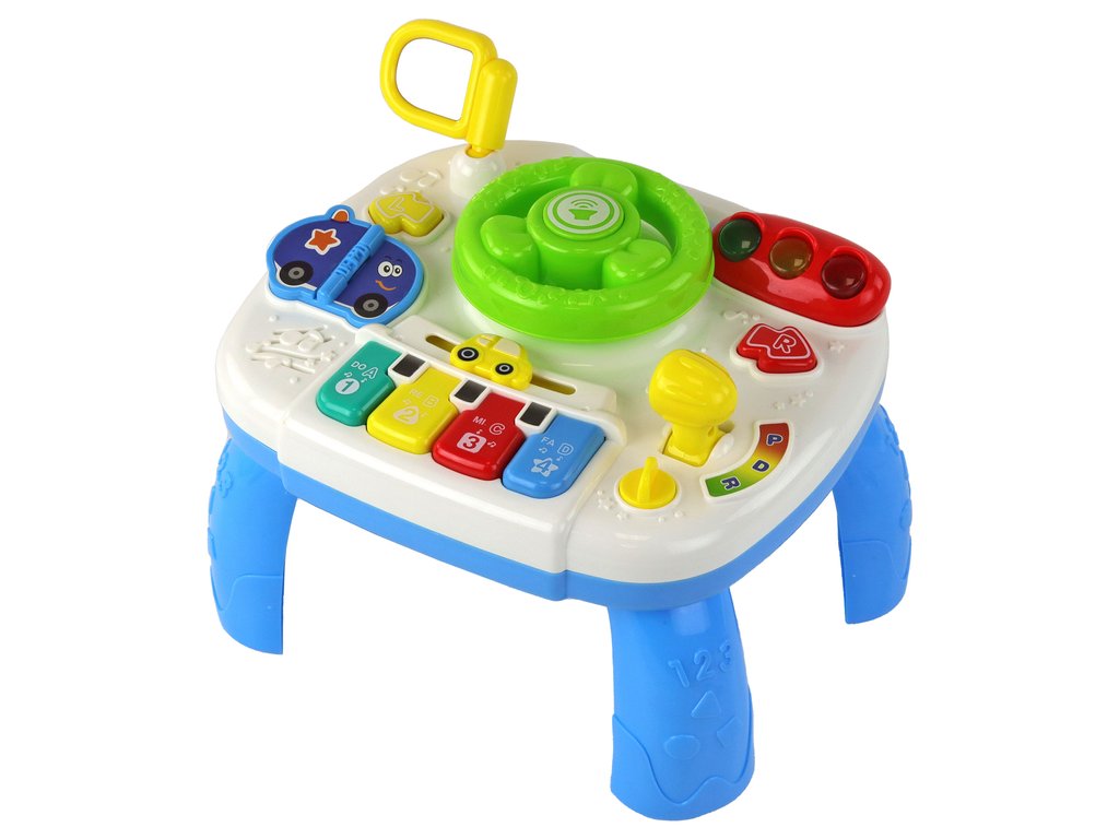 Открийте тази интерактивна образователна масичка 2в1, създадена с мисъл за комплексното развитие на малките откриватели. В центъра на таблата се намира интерактивен волан с реалистична клаксона, мигащи мигачи, весело тиктакане в двете посоки и активна пътна сигнализация. Това не е само забавление, а и обучение по правилата за движение и координация на движенията.