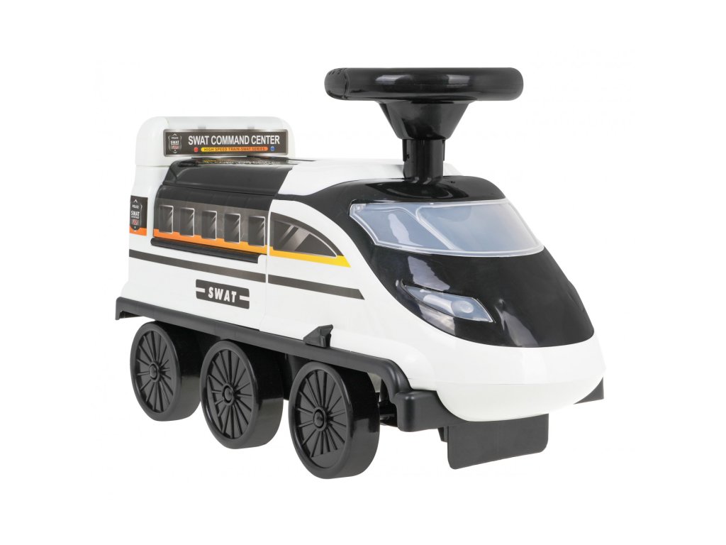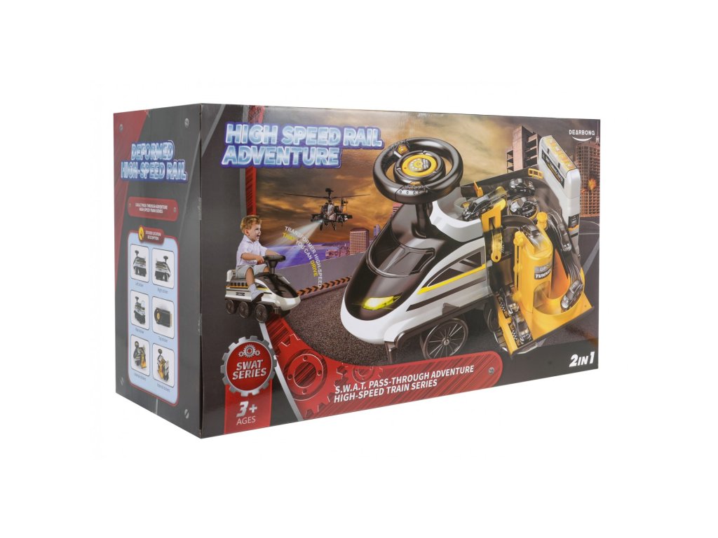 Интерактивно балансно колело 2в1 с полицейски паркинг под седалката, звукови и светлинни ефекти, подходящо за деца от 3 години. На задната страна на локомотива има звукова плочка с бутони, които при натискане издават мелодии, истории и звуци на животни. Гласовият съпровод е на английски език. Локомотивът разполага с светещи фарове.