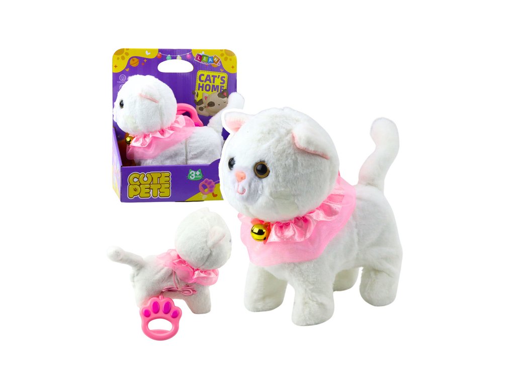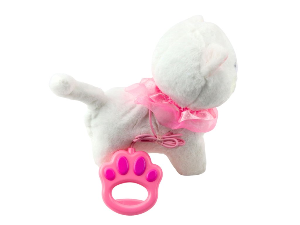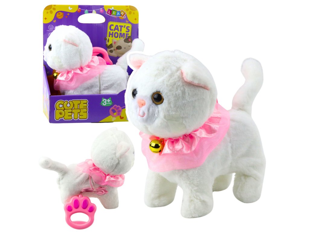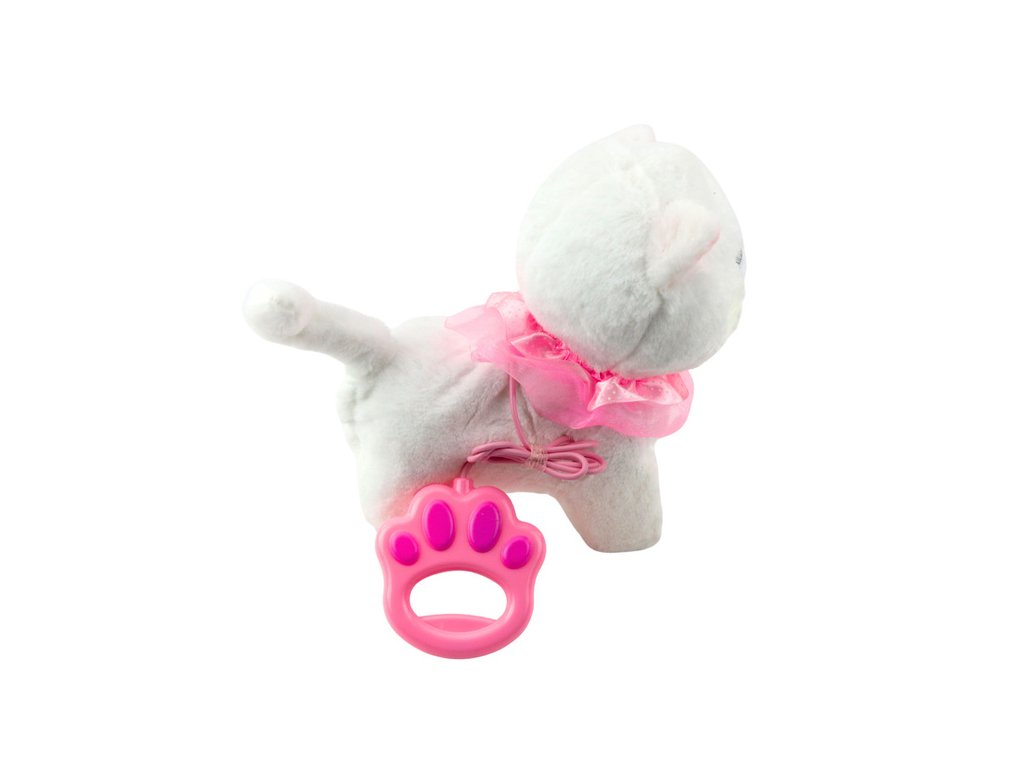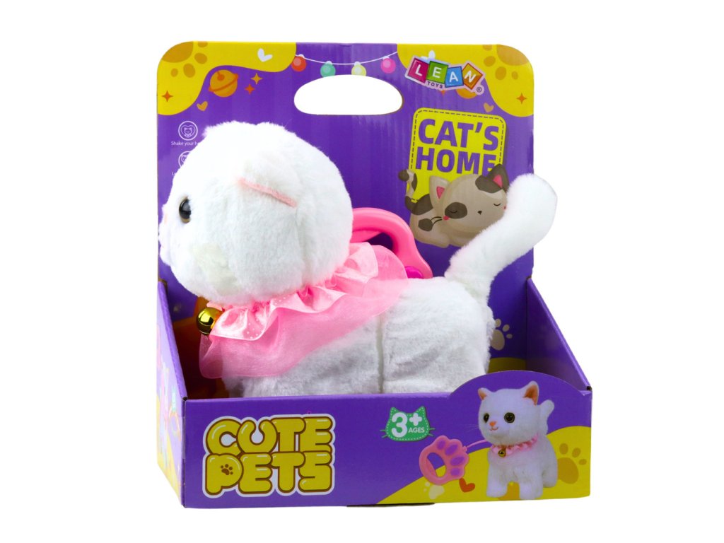 Интерактивната бяла котка е очарователна играчка, която ще зарадва всяко дете. Тя е изработена от мек плюш, украсена с розов волан и очарователна камбанка, изглежда изключително реалистично и привлича вниманието на най-малките. Приложеният повод с бутон позволява управление - след натискане котката започва да ходи и да издава мяукащи звуци.