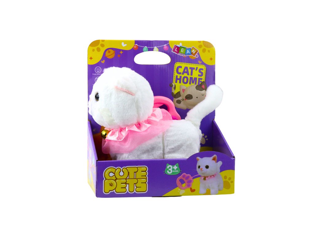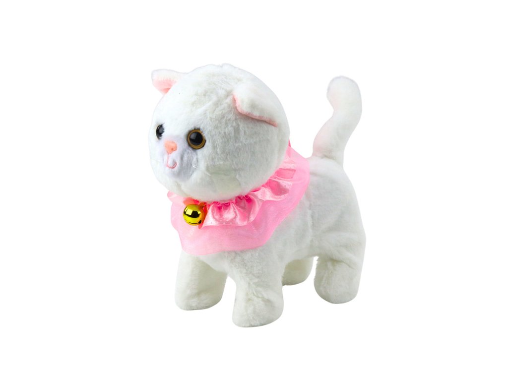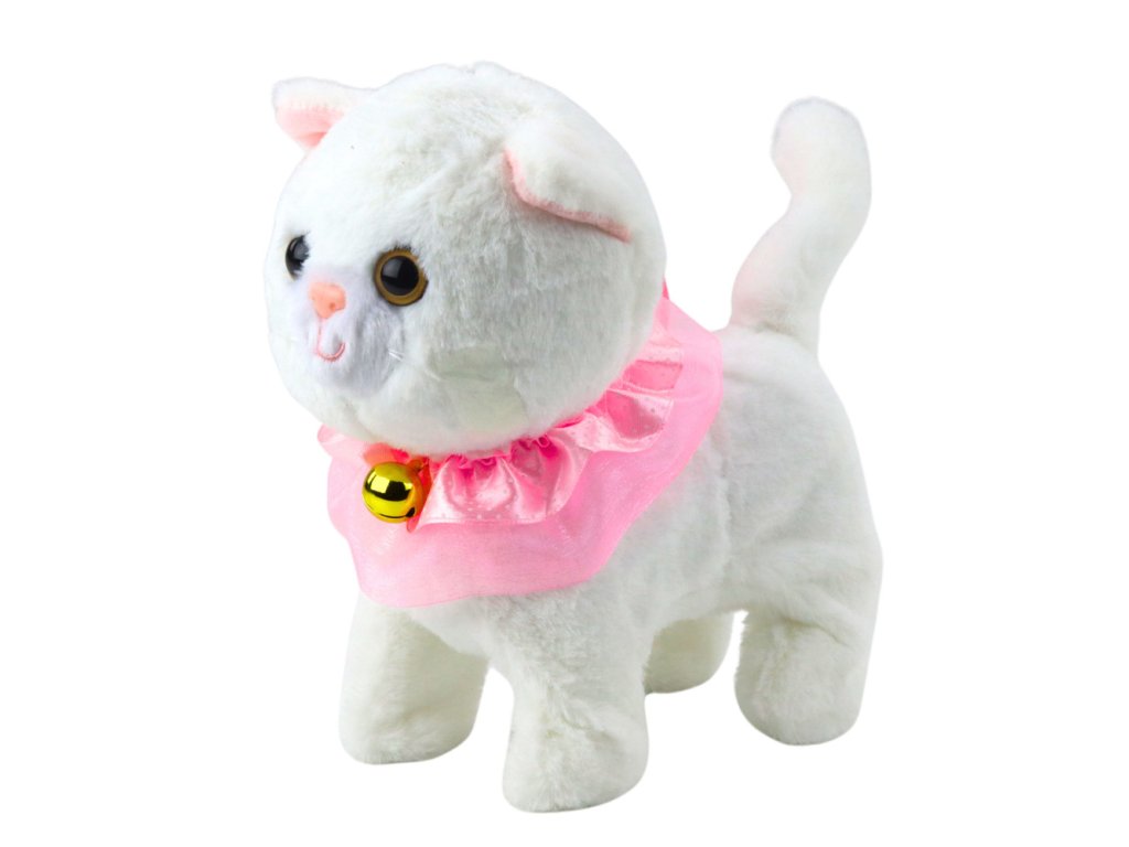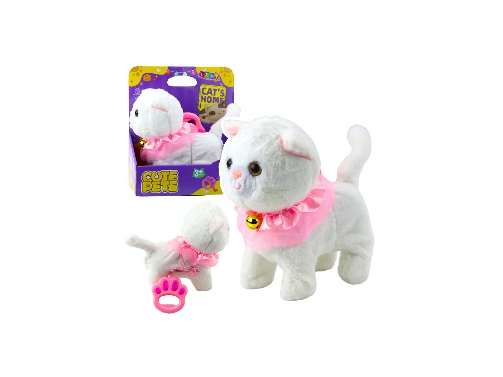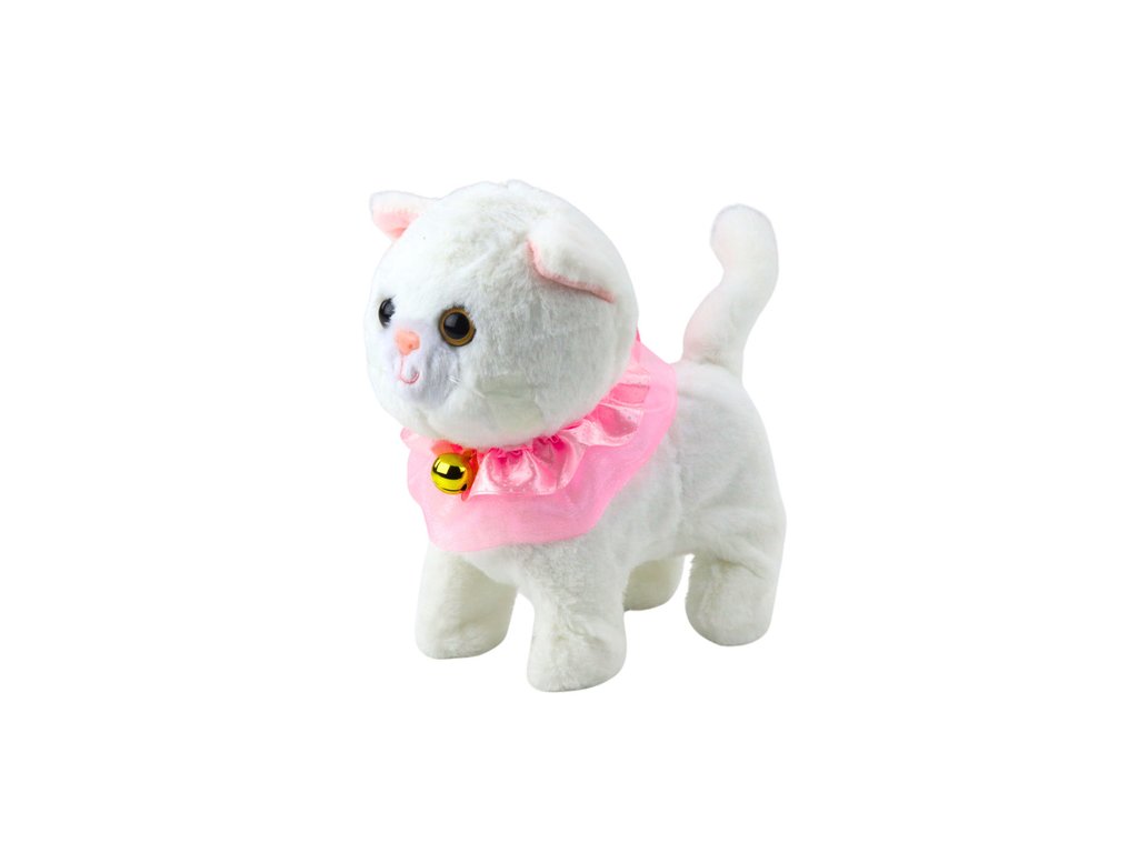 Интерактивната бяла котка е очарователна играчка, която ще зарадва всяко дете. Тя е изработена от мек плюш, украсена с розов волан и очарователна камбанка, изглежда изключително реалистично и привлича вниманието на най-малките. Приложеният повод с бутон позволява управление - след натискане котката започва да ходи и да издава мяукащи звуци.