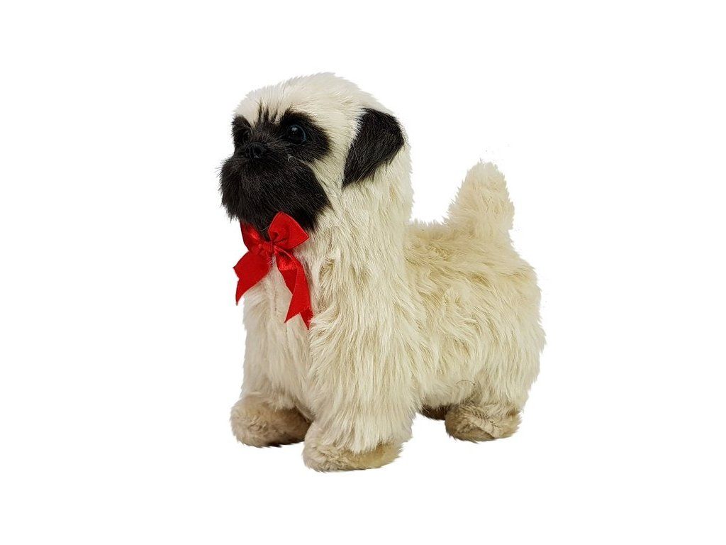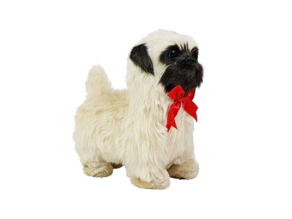Кученцето има кремава козина с черни детайли по муцуната и ушите, а тъмнокафявите очи привличат вниманието. Тя е перфектно реалистично копие на породата. Освен това, красивата червена панделка на врата придава допълнително очарование.