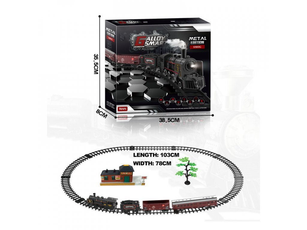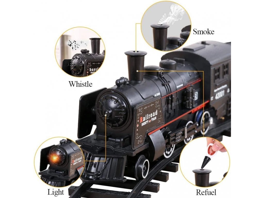 Влакче с парен локомотив и реалистични звуци. Локомотивът отделя дим от комина по време на движение (за да се отдели пара, първо капнете вода в локомотива – в комплекта е включена пипета). При движение светва предната светлина на локомотива. Трасето е с форма на елипса с размери 143 x 106 см.