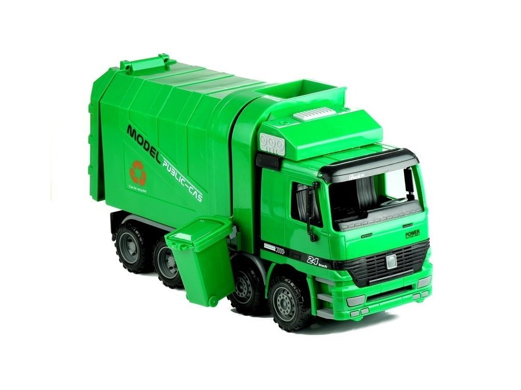 Камион за смет със зелен контейнер ще бъде чудесно допълнение към колекцията ви от превозни средства и определено няма да стои бездействащ. Колата е в класически зелен цвят с черни и сиви детайли.