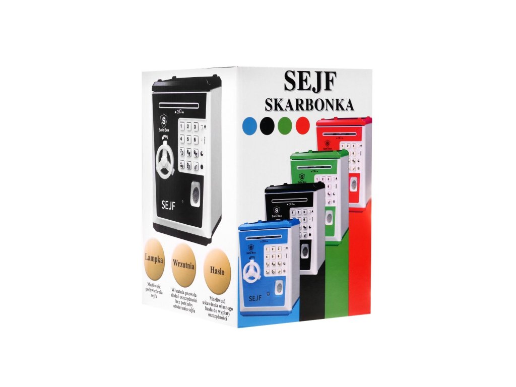 - Касичка сейф червена, захранвана с 3 броя AA батерии 1,5 V (батериите не са включени в комплекта)