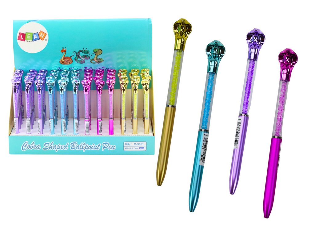 Тази елегантна Химикалка с кобра синьо мастило 0,7 мм микс съчетава стил и оригиналност. Прозрачното тяло с блестящи камъчета придава луксозен вид, докато фигурката на кобра добавя уникален детайл. Идеална както като практичен аксесоар, така и като дизайнерски подарък.