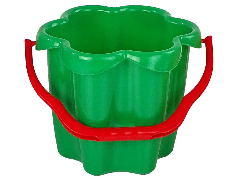 Представяме ви малка пластмасова кофа за пясък с форма на цвете и дръжка, идеална за игра на пясъчника.